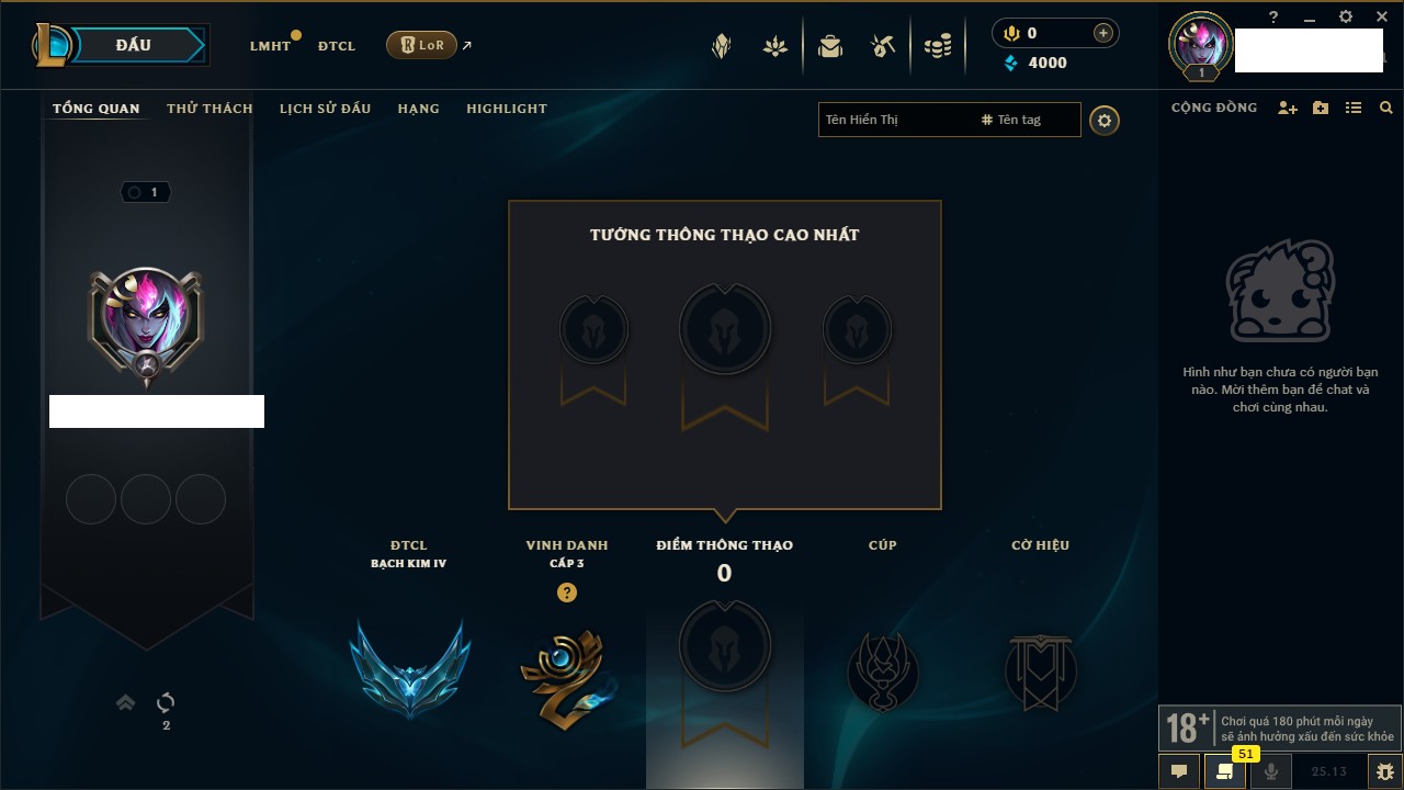 Rank Đơn: Bạch Kim IIIKhung: Bạch kimTướng: 59 - Còn 20316 THXTrang Phục: 29Rank ĐTCL: Chưa RankLinh Thú: 3