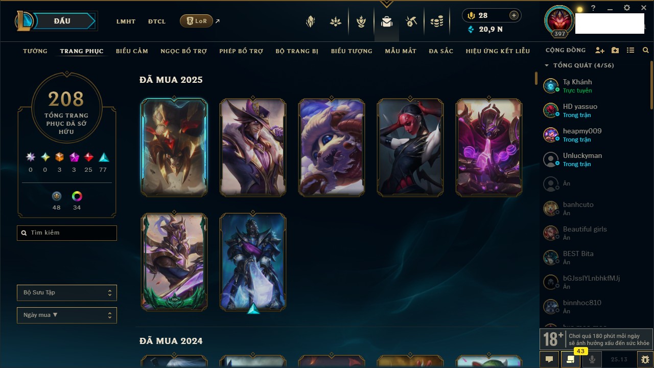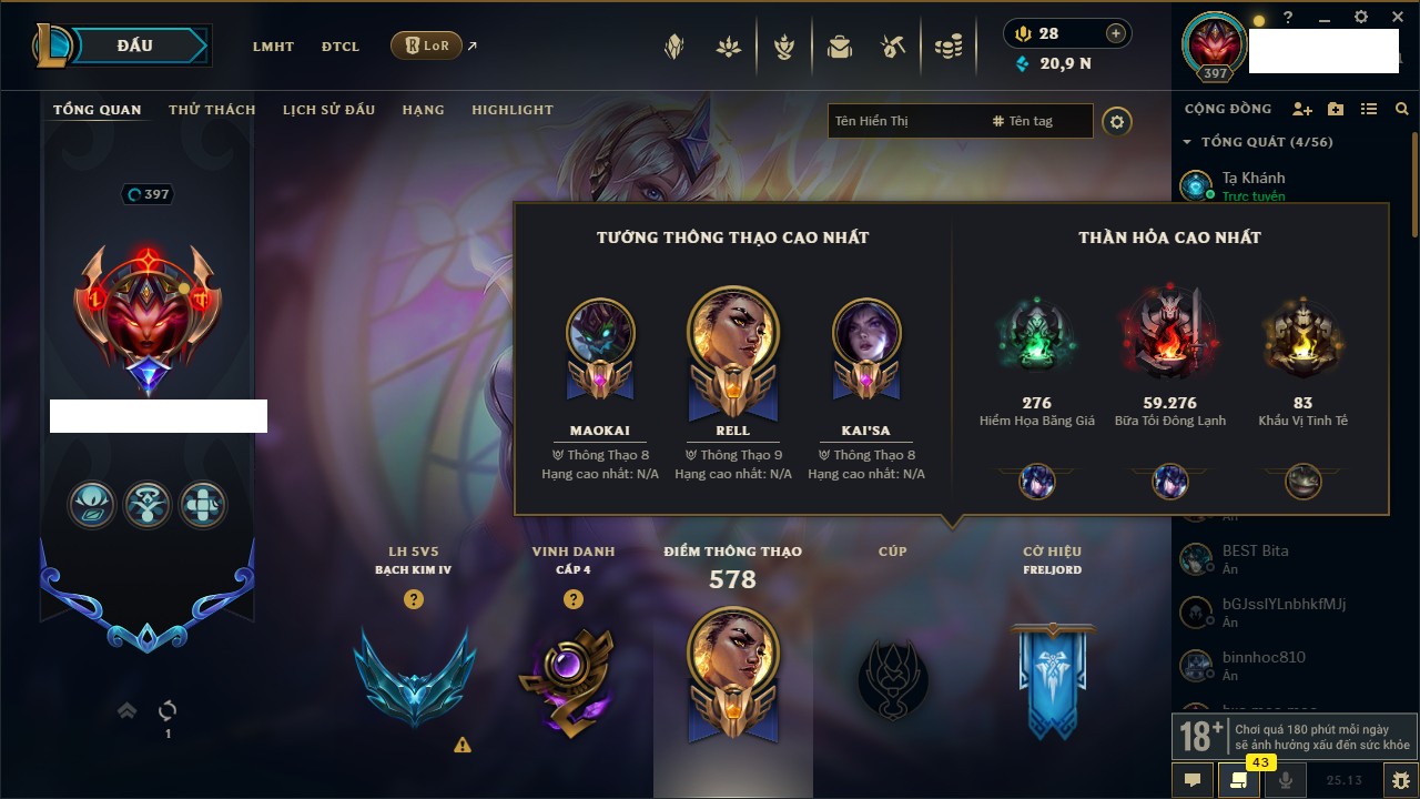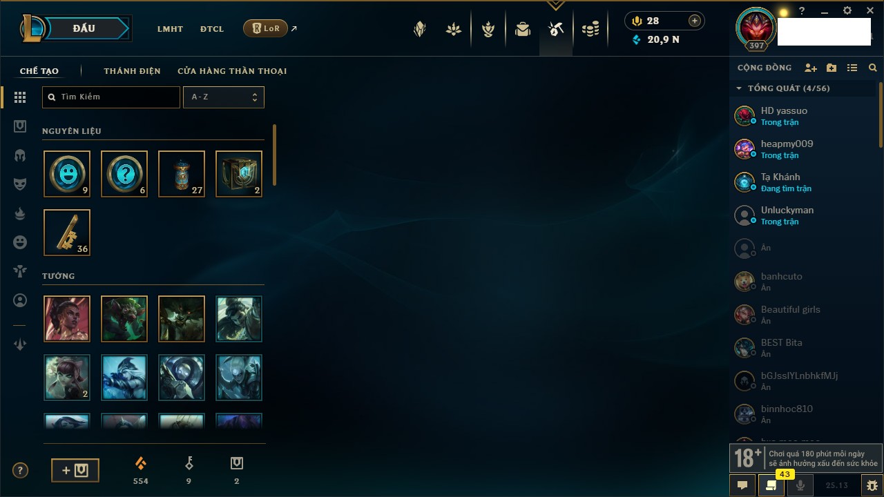 Rank Đơn: Bạc IVKhung: VàngTướng: 172 - Còn 358384 THXTrang Phục: 177Rank ĐTCL: Lục Bảo IILinh Thú: 211