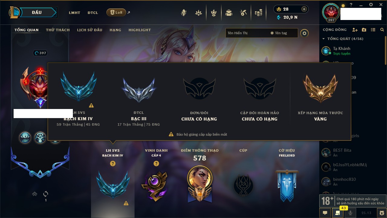 Rank Đơn: Bạc IIKhung: VàngTướng: 171 - Còn 332462 THXTrang Phục: 165Rank ĐTCL: Kim Cương IVLinh Thú: 181