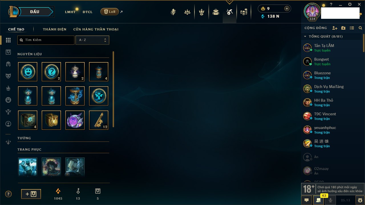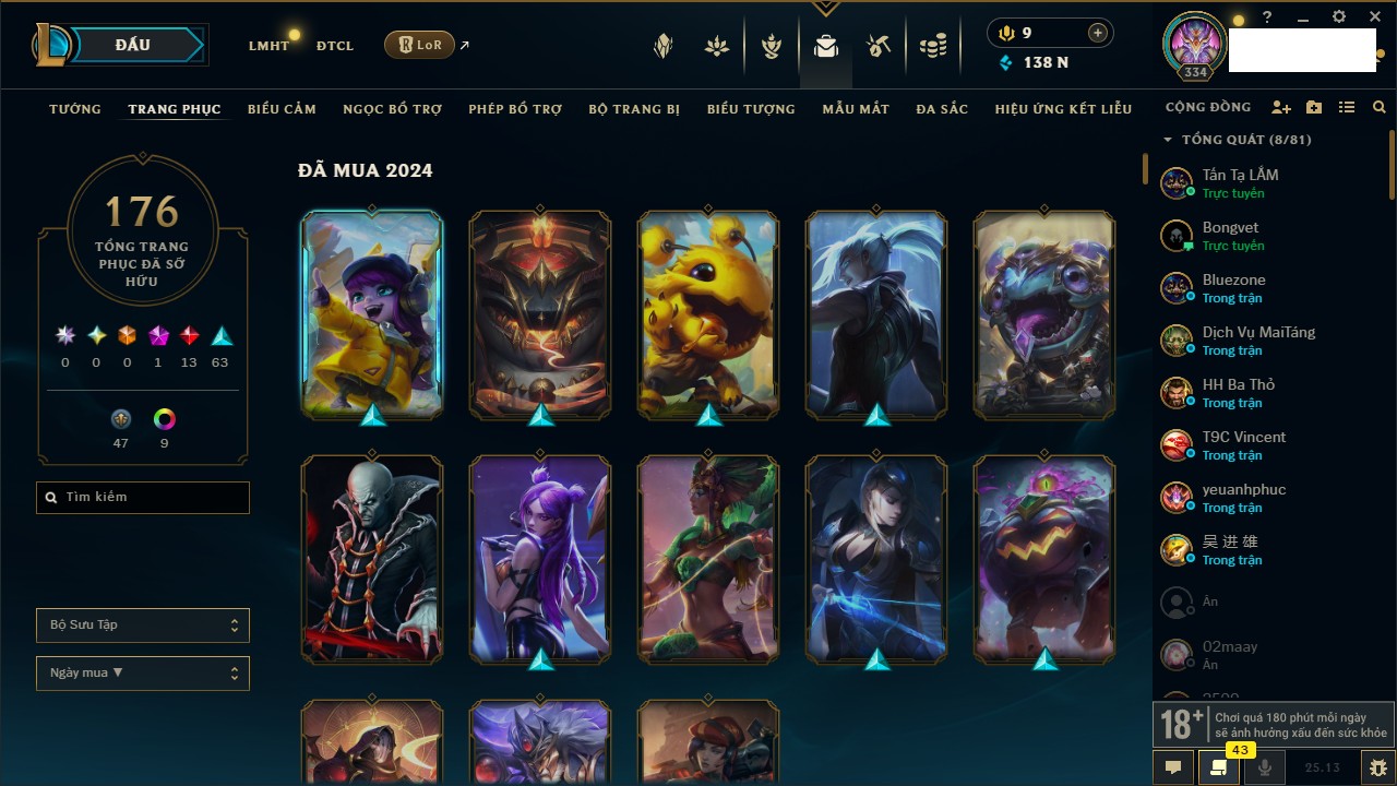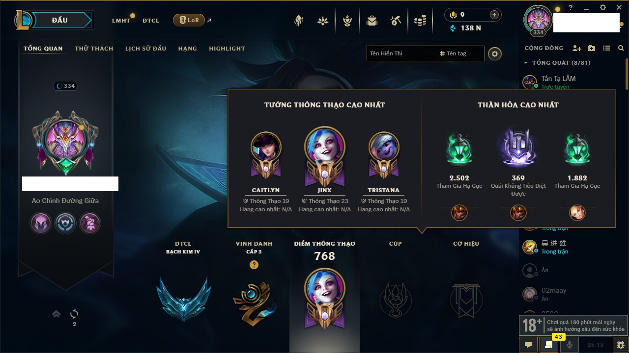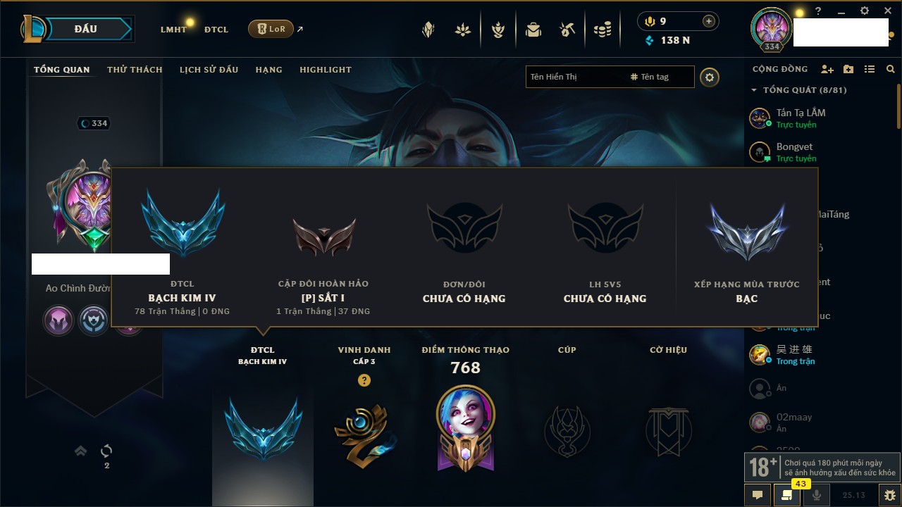 Rank Đơn: Bạch Kim IV Khung: Chưa có khung Tướng: 172 - Còn 29488 THX Trang Phục: 120 Rank ĐTCL: Bạc III Linh Thú: 50