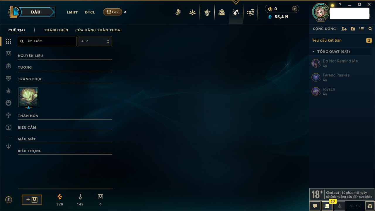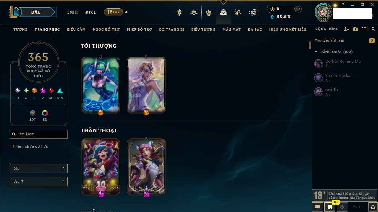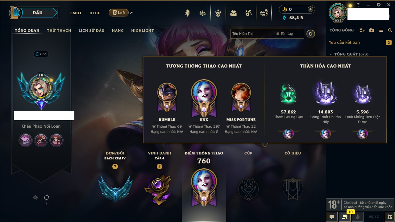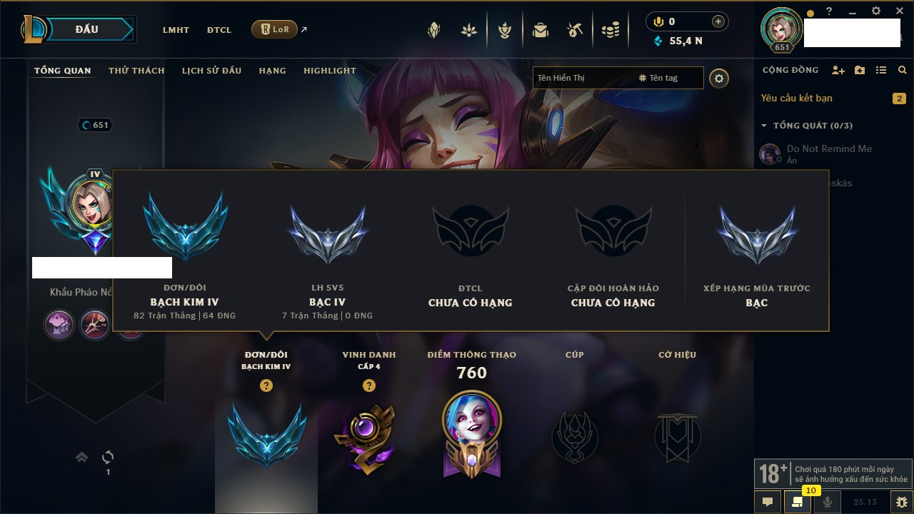 Rank Đơn: Bạch Kim IV Khung: Bạch kim Tướng: 170 - Còn 95523 THX Trang Phục: 243 Rank ĐTCL: Chưa Rank Linh Thú: 150