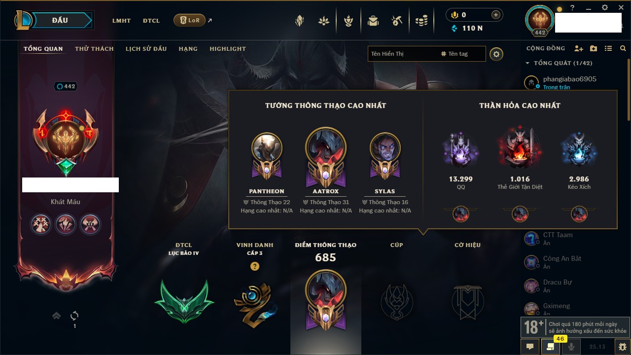 Rank Đơn: Bạch Kim IIIKhung: Bạch kimTướng: 170 - Còn 66107 THXTrang Phục: 201Rank ĐTCL: Chưa RankLinh Thú: 83