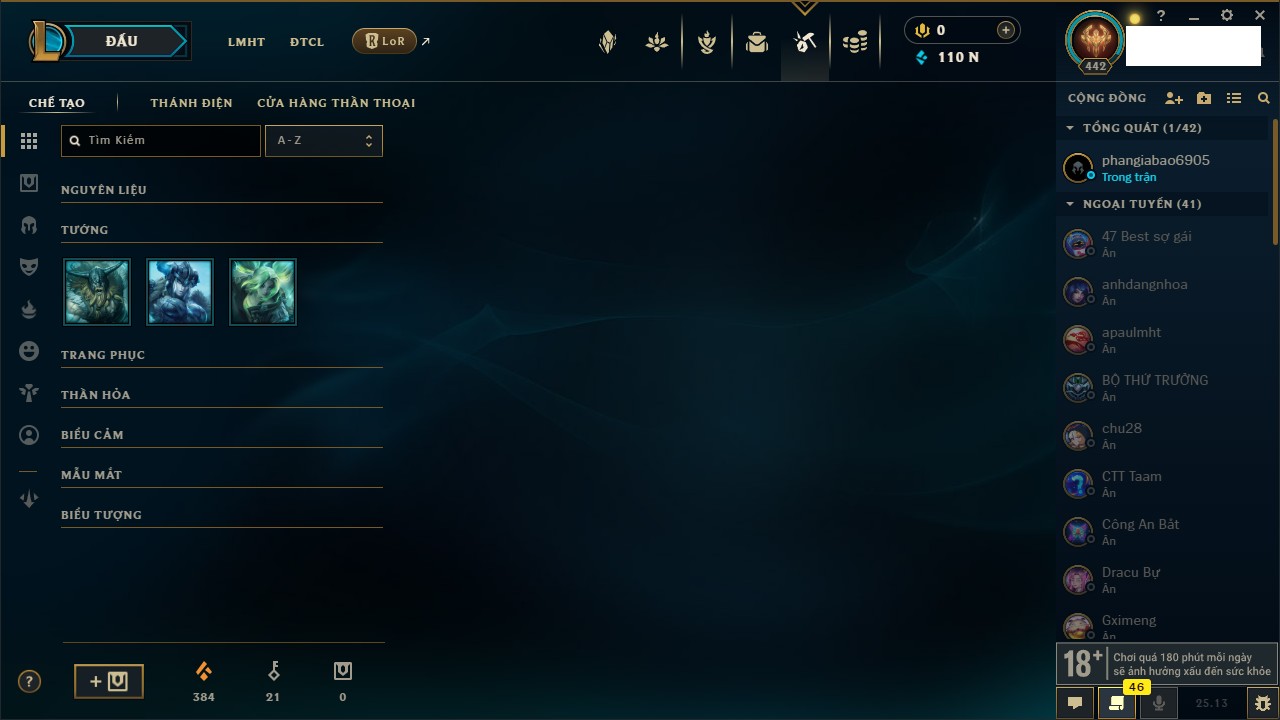 Rank Đơn: Bạc IIIKhung: BạcTướng: 170 - Còn 42417 THXTrang Phục: 262Rank ĐTCL: Chưa RankLinh Thú: 132