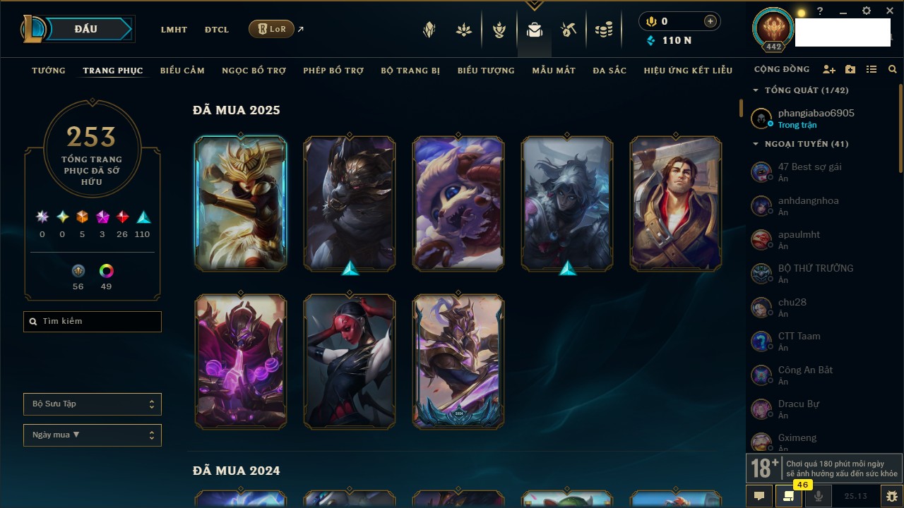 Rank Đơn: Bạc IKhung: BạcTướng: 170 - Còn 110919 THXTrang Phục: 253Rank ĐTCL: Chưa RankLinh Thú: 173