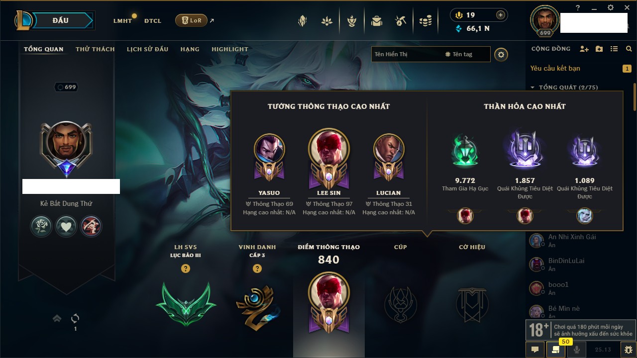 Rank Đơn: Bạch Kim IIIKhung: Bạch kimTướng: 170 - Còn 66107 THXTrang Phục: 201Rank ĐTCL: Chưa RankLinh Thú: 83
