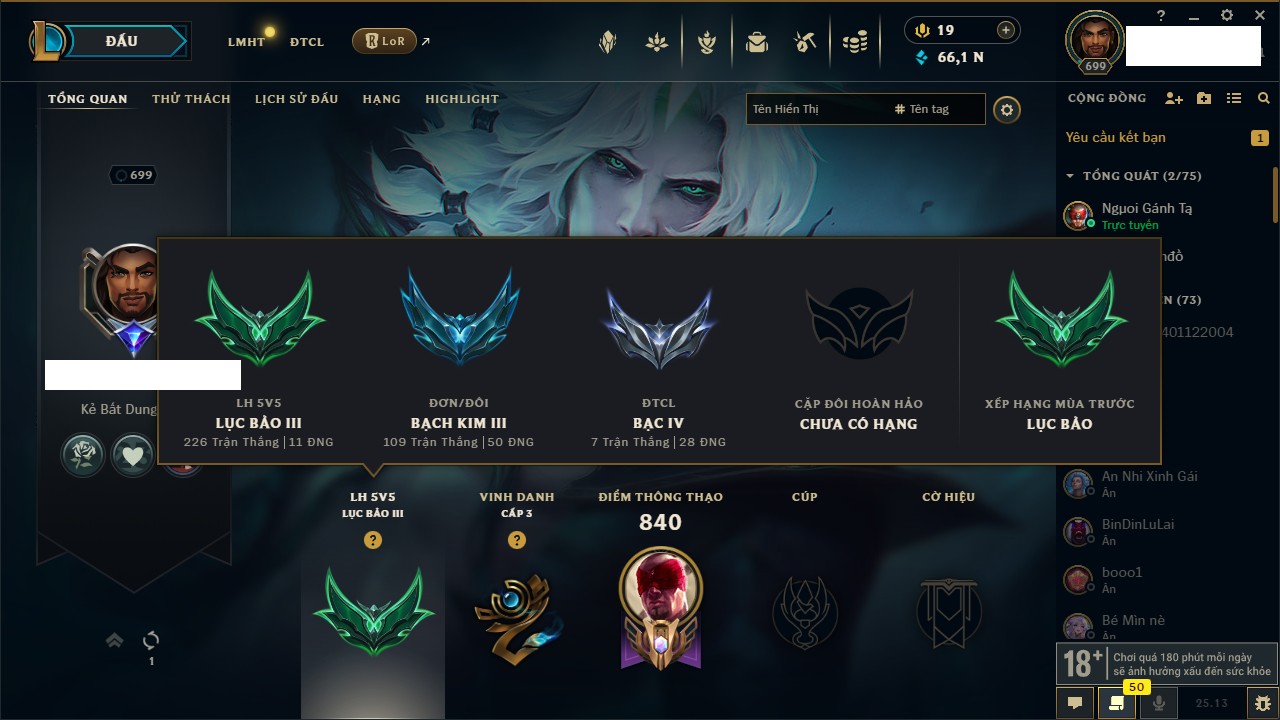 Rank Đơn: Bạch Kim IIIKhung: VàngTướng: 170 - Còn 106147 THXTrang Phục: 261Rank ĐTCL: Chưa RankLinh Thú: 89