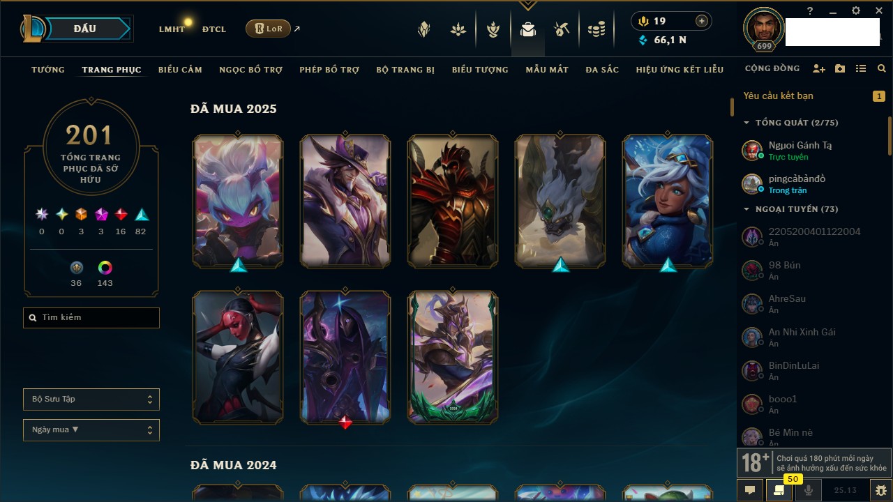 Rank Đơn: Vàng IIIKhung: Chưa có khungTướng: 171 - Còn 79750 THXTrang Phục: 288Rank ĐTCL: Chưa RankLinh Thú: 79