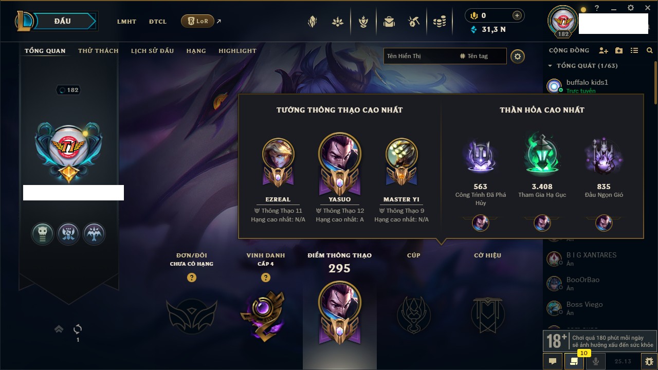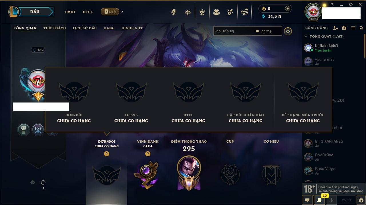 Rank Đơn: Bạc IIIKhung: Chưa có khungTướng: 163 - Còn 66843 THXTrang Phục: 182Rank ĐTCL: Kim Cương IVLinh Thú: 114
