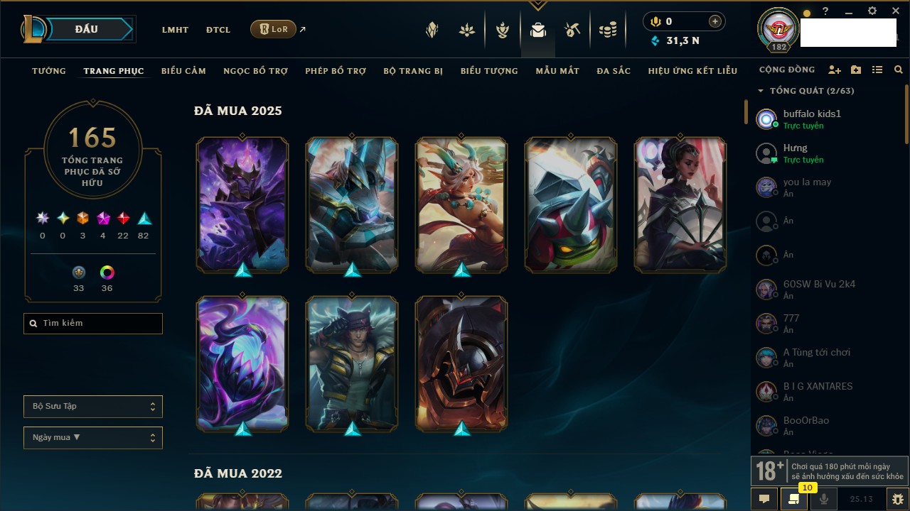 Rank Đơn: Lục Bảo IVKhung: Bạch kimTướng: 171 - Còn 128452 THXTrang Phục: 193Rank ĐTCL: Bạc IIILinh Thú: 100