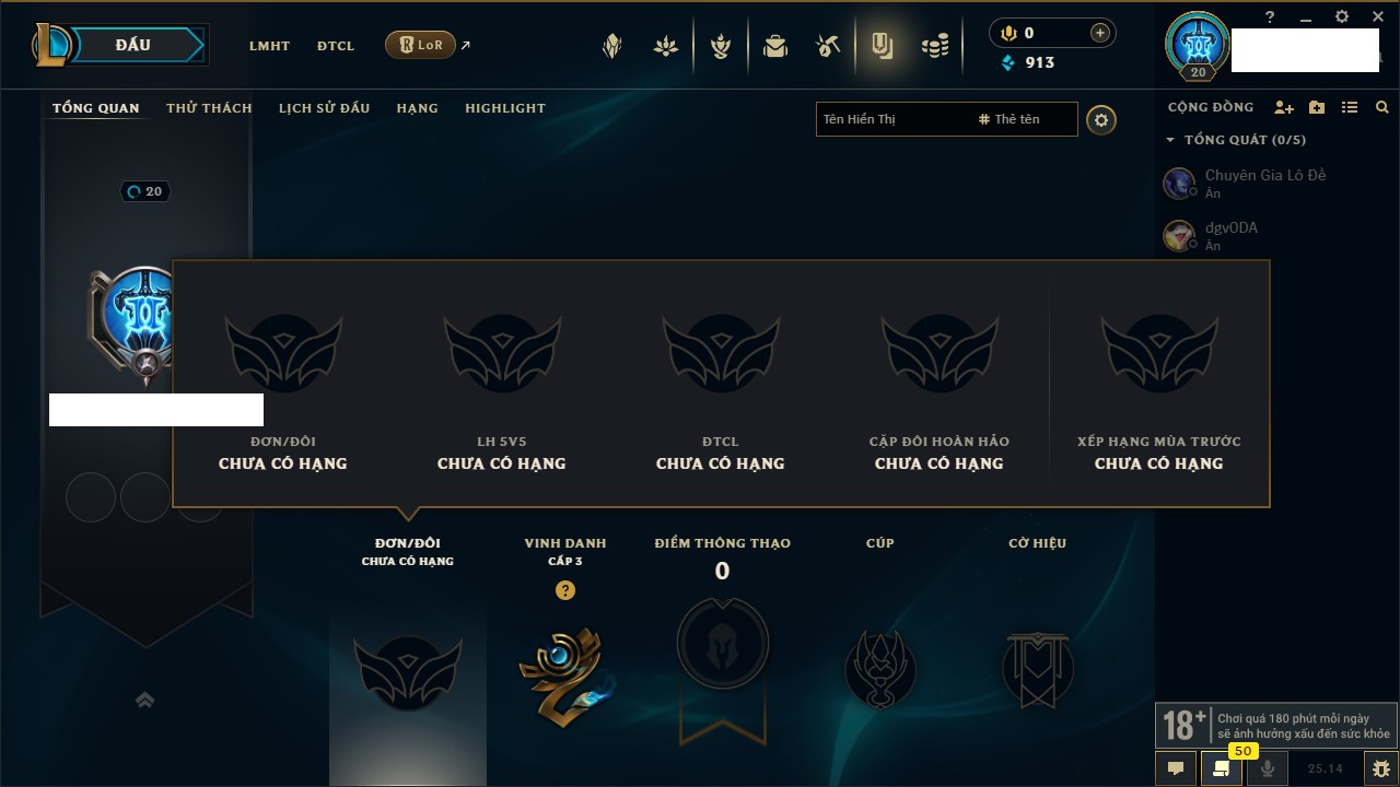 Rank Đơn: Chưa rank mùa nàoKhung: Chưa có khungTướng: 0 - Còn 6300 THXTrang Phục: 0Rank ĐTCL: Bạc IIILinh Thú: 3