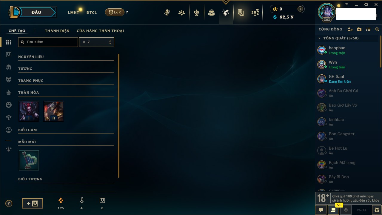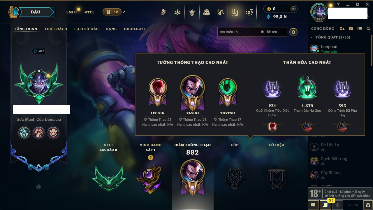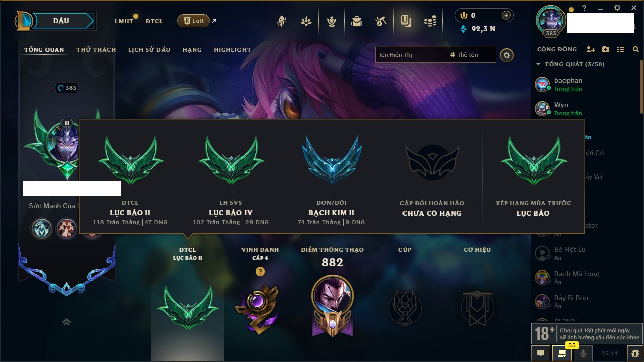 Rank Đơn: Bạch Kim IIIKhung: Bạch kimTướng: 171 - Còn 251383 THXTrang Phục: 229Rank ĐTCL: Sắt IILinh Thú: 51