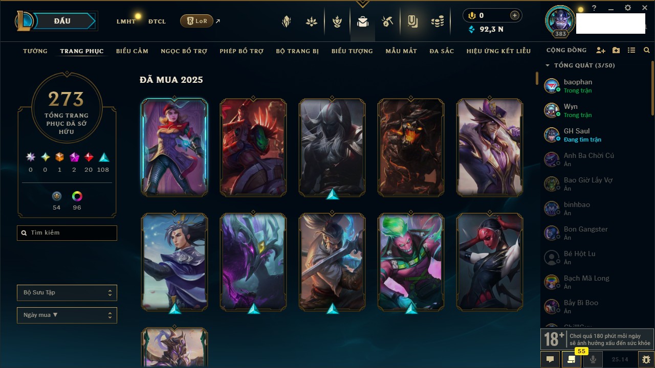 Rank Đơn: Vàng IIIKhung: VàngTướng: 171 - Còn 88128 THXTrang Phục: 329Rank ĐTCL: Chưa RankLinh Thú: 41