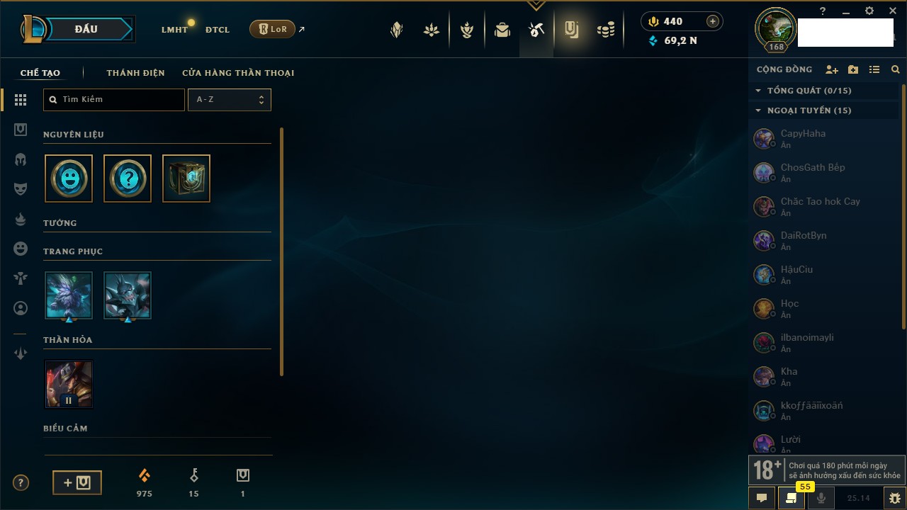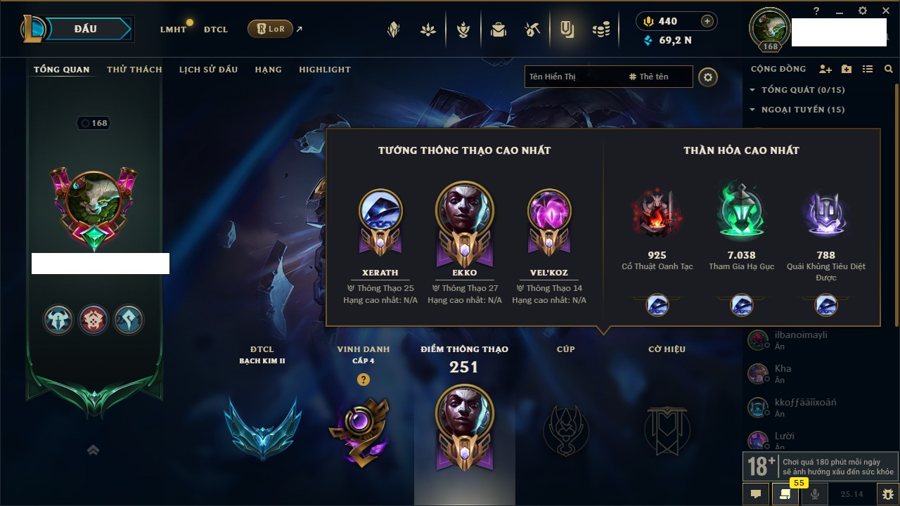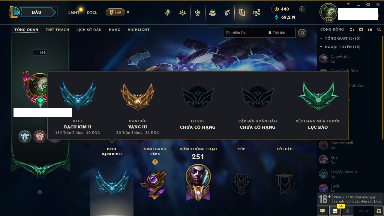 Rank Đơn: Bạc IIIKhung: Chưa có khungTướng: 171 - Còn 21493 THXTrang Phục: 252Rank ĐTCL: Bạch Kim IVLinh Thú: 123