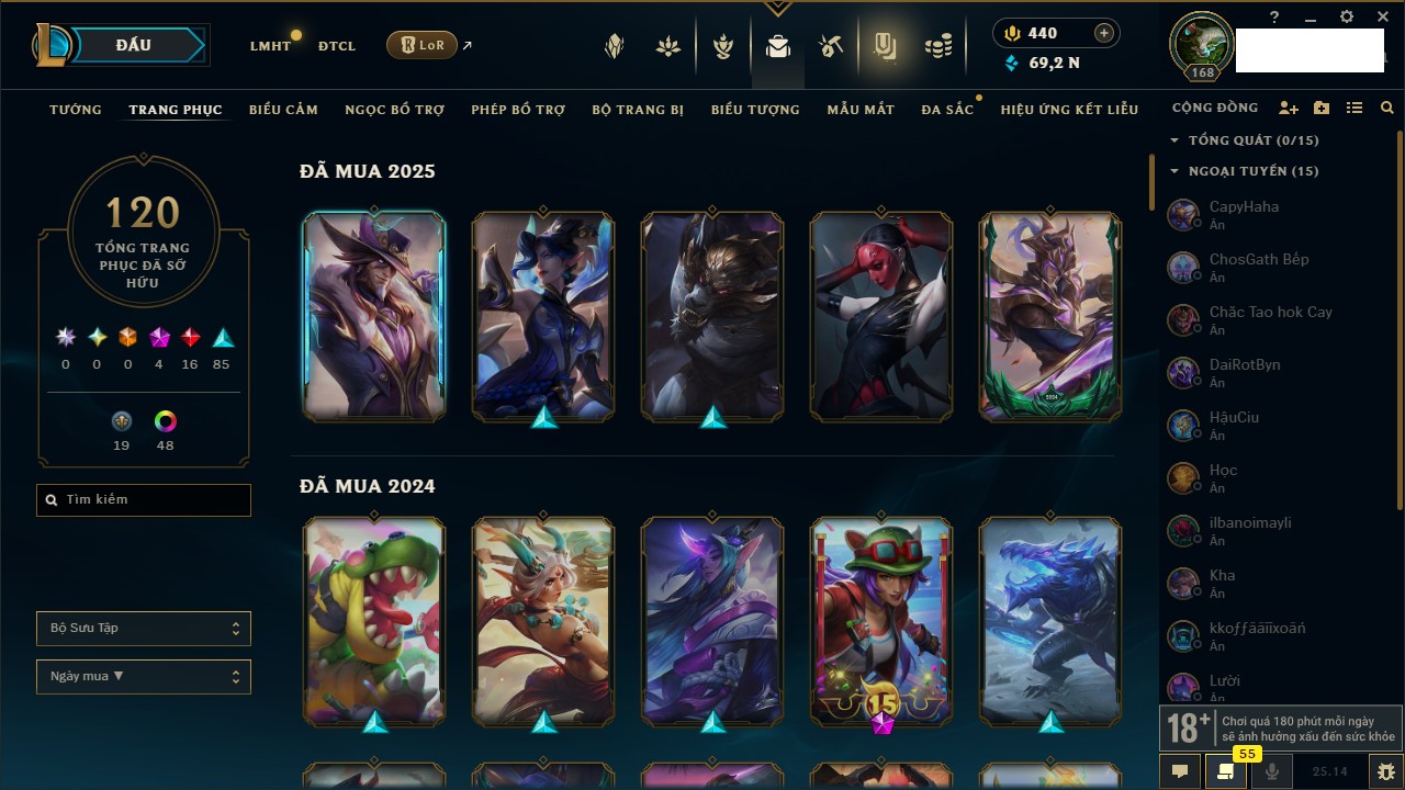 Rank Đơn: Vàng IIIKhung: VàngTướng: 161 - Còn 162202 THXTrang Phục: 179Rank ĐTCL: Chưa RankLinh Thú: 20