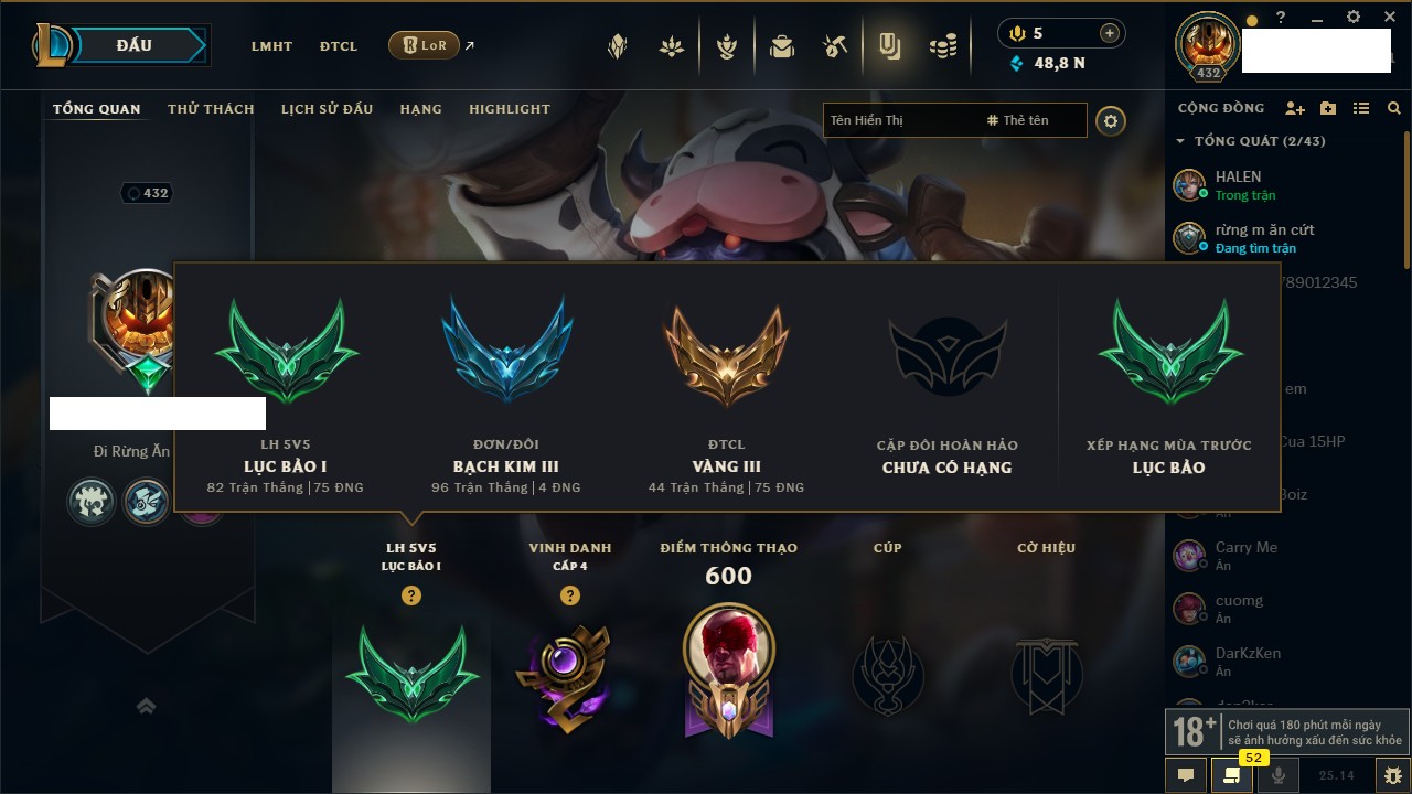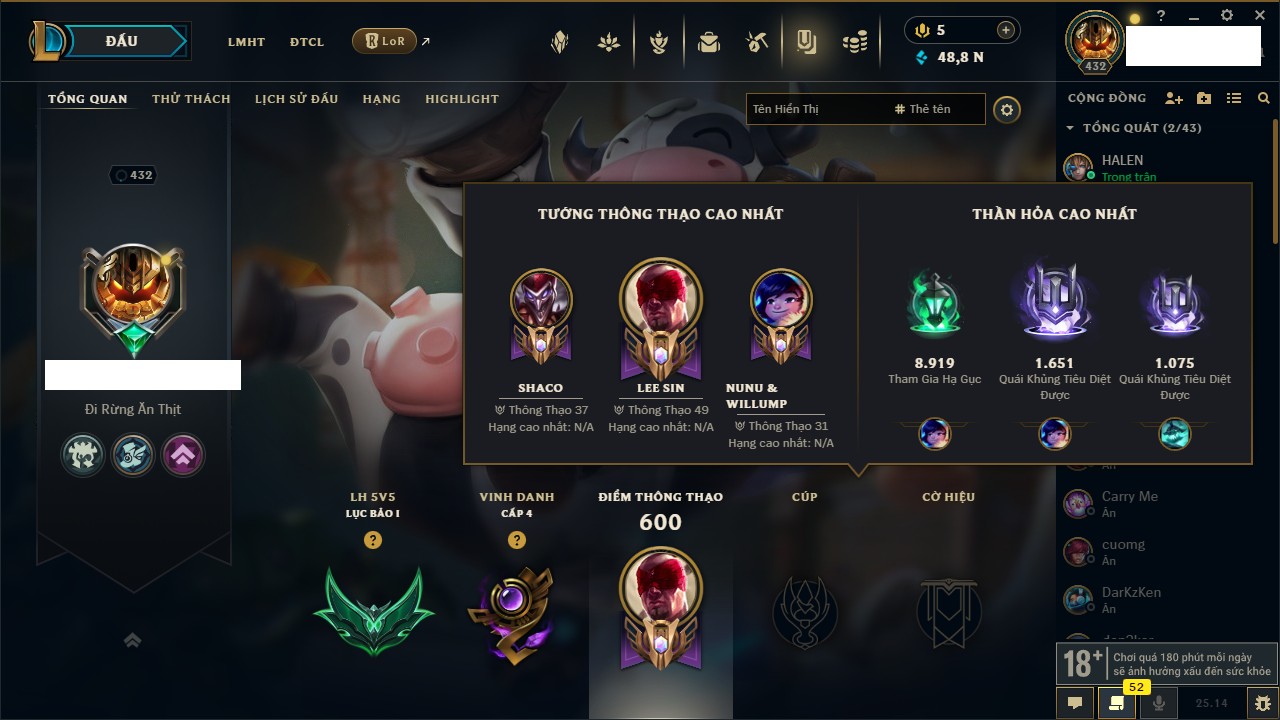Rank Đơn: Chưa RankKhung: Bạch kimTướng: 172 - Còn 81 THXTrang Phục: 226Rank ĐTCL: Chưa RankLinh Thú: 193
