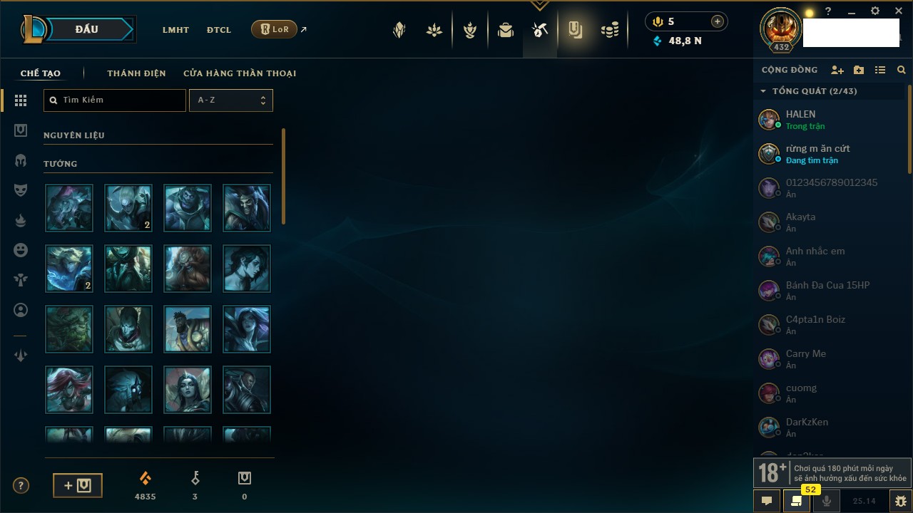 Rank Đơn: Chưa RankKhung: Chưa có khungTướng: 157 - Còn 2008 THXTrang Phục: 206Rank ĐTCL: Chưa RankLinh Thú: 29