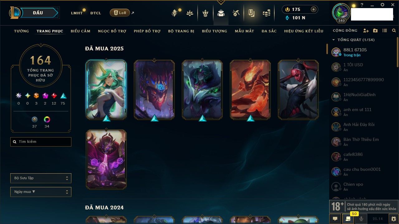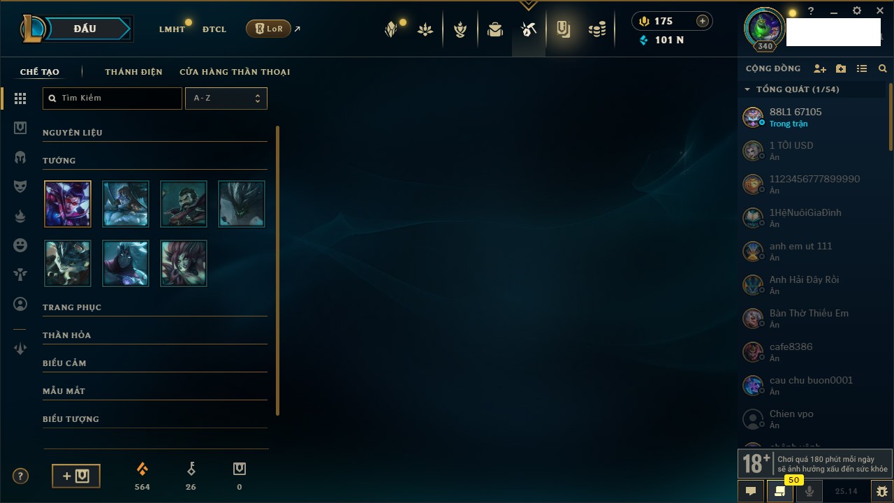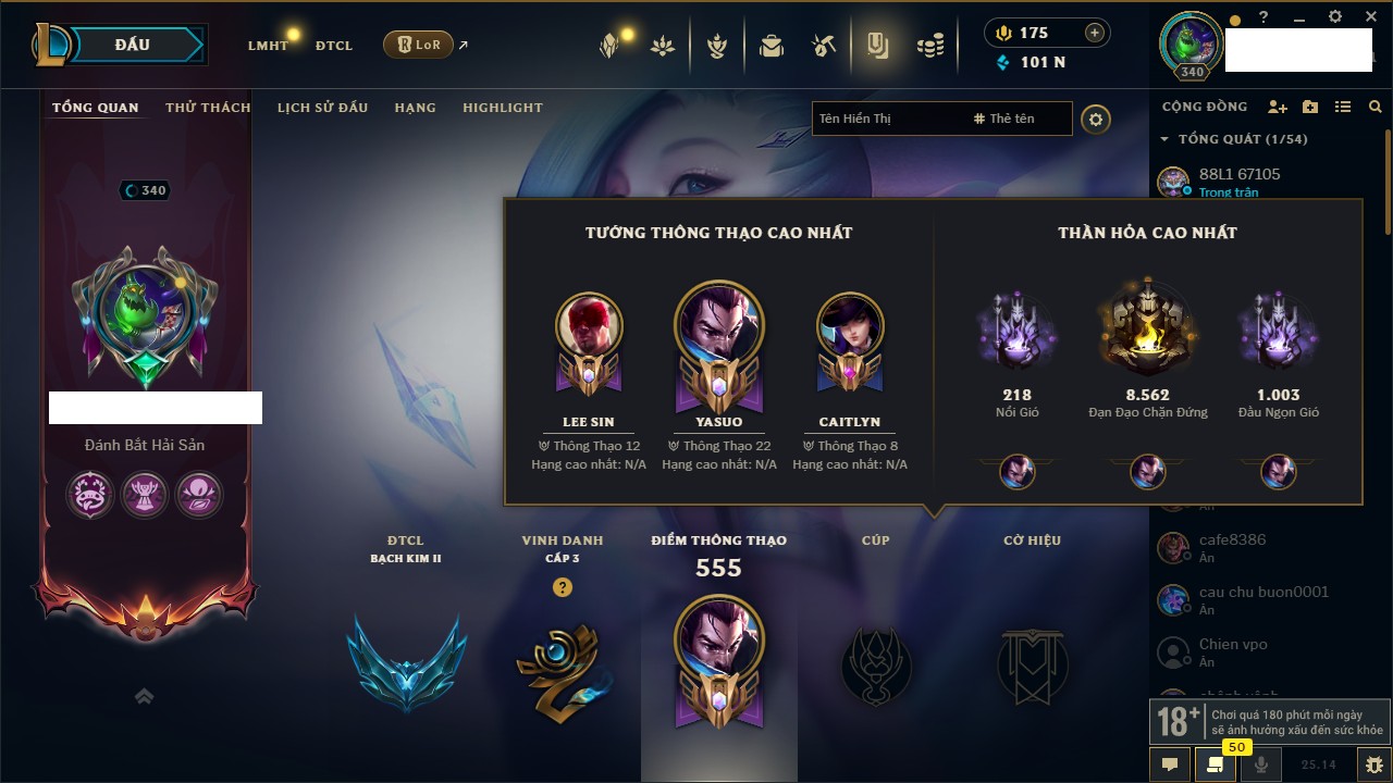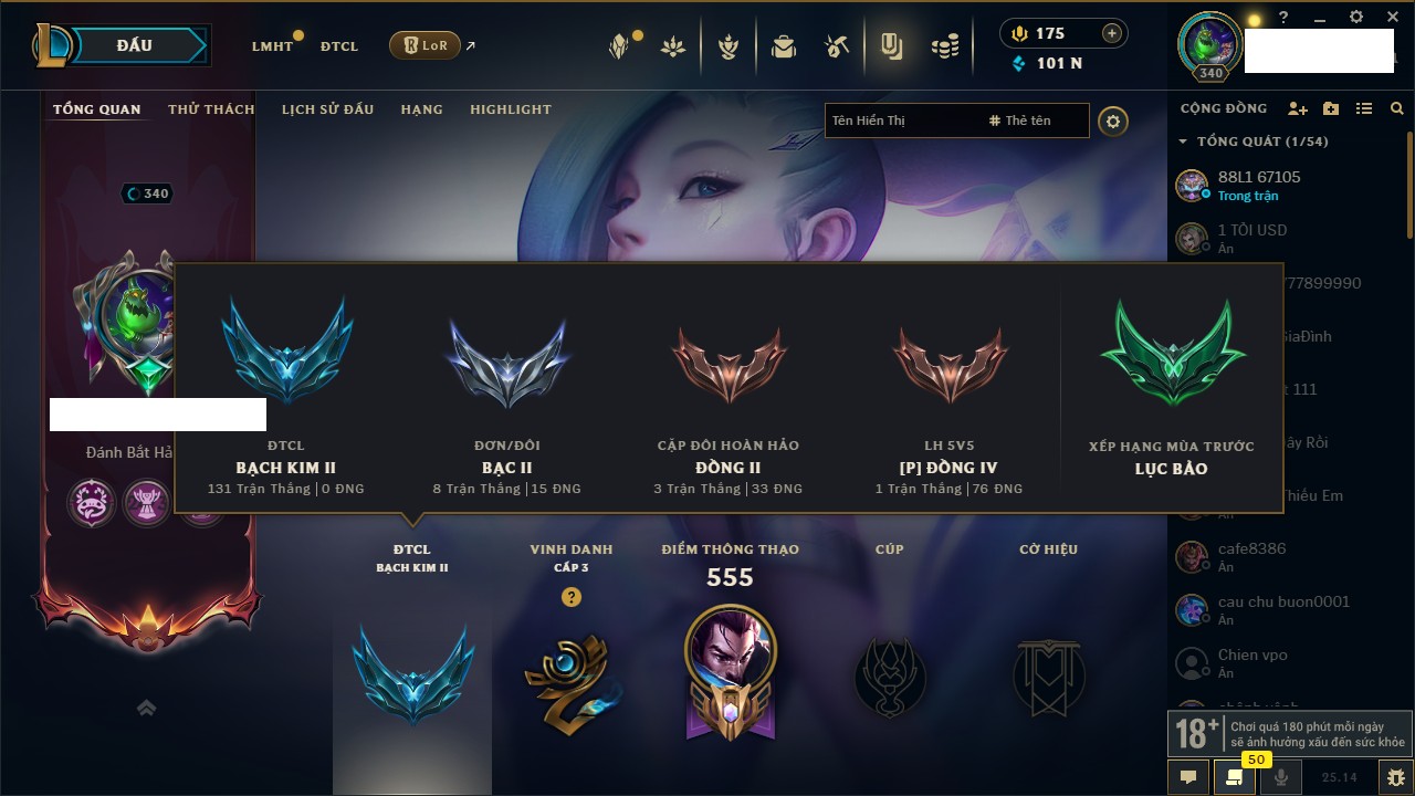 Rank Đơn: Vàng IIIKhung: BạcTướng: 171 - Còn 101359 THXTrang Phục: 88Rank ĐTCL: Kim Cương IVLinh Thú: 200
