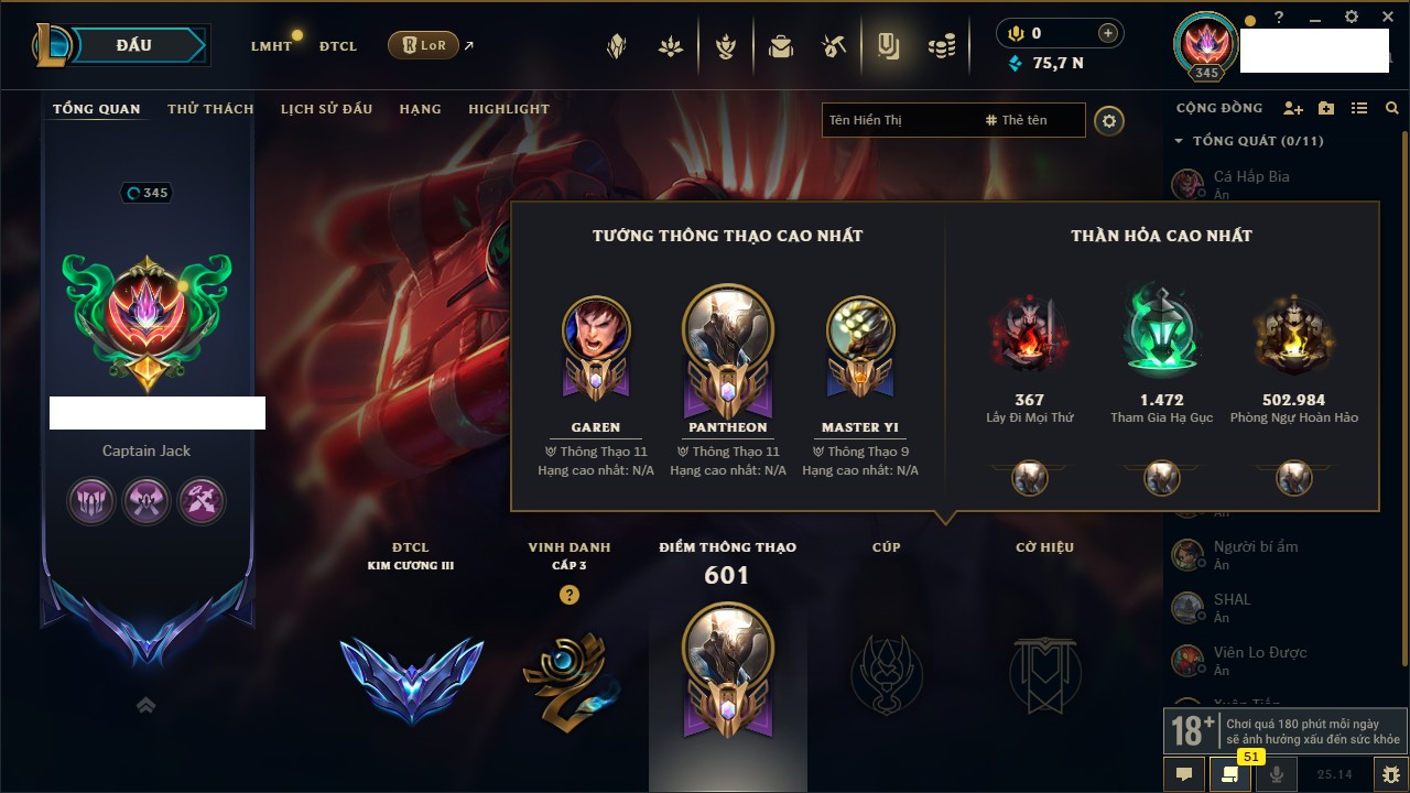 Rank Đơn: Bạc IIIKhung: Chưa có khungTướng: 163 - Còn 66843 THXTrang Phục: 182Rank ĐTCL: Kim Cương IVLinh Thú: 114