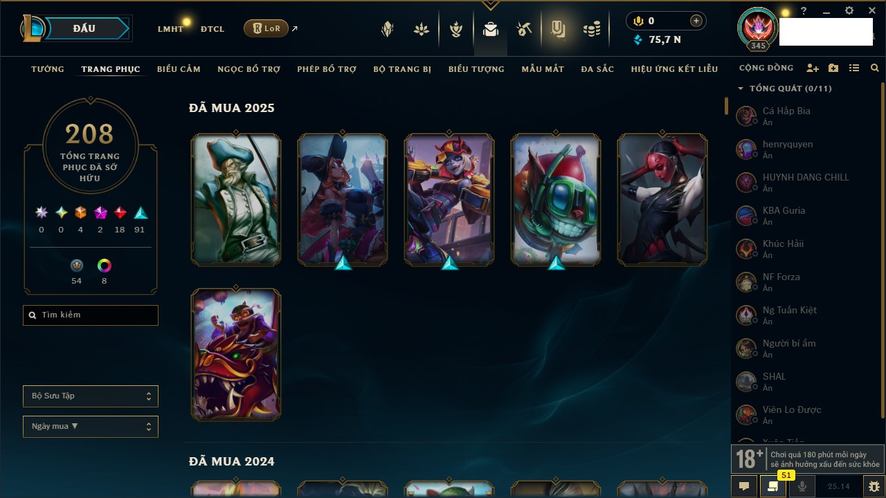 Rank Đơn: Vàng IIIKhung: BạcTướng: 171 - Còn 101359 THXTrang Phục: 88Rank ĐTCL: Kim Cương IVLinh Thú: 200