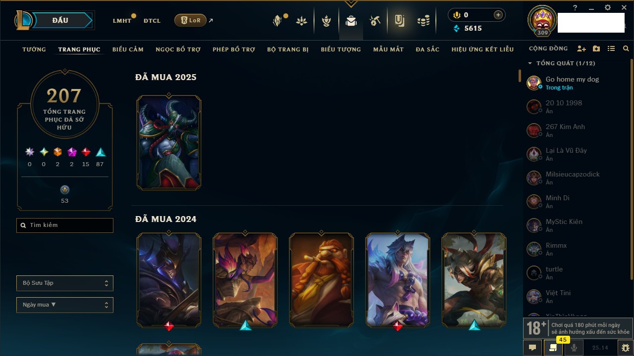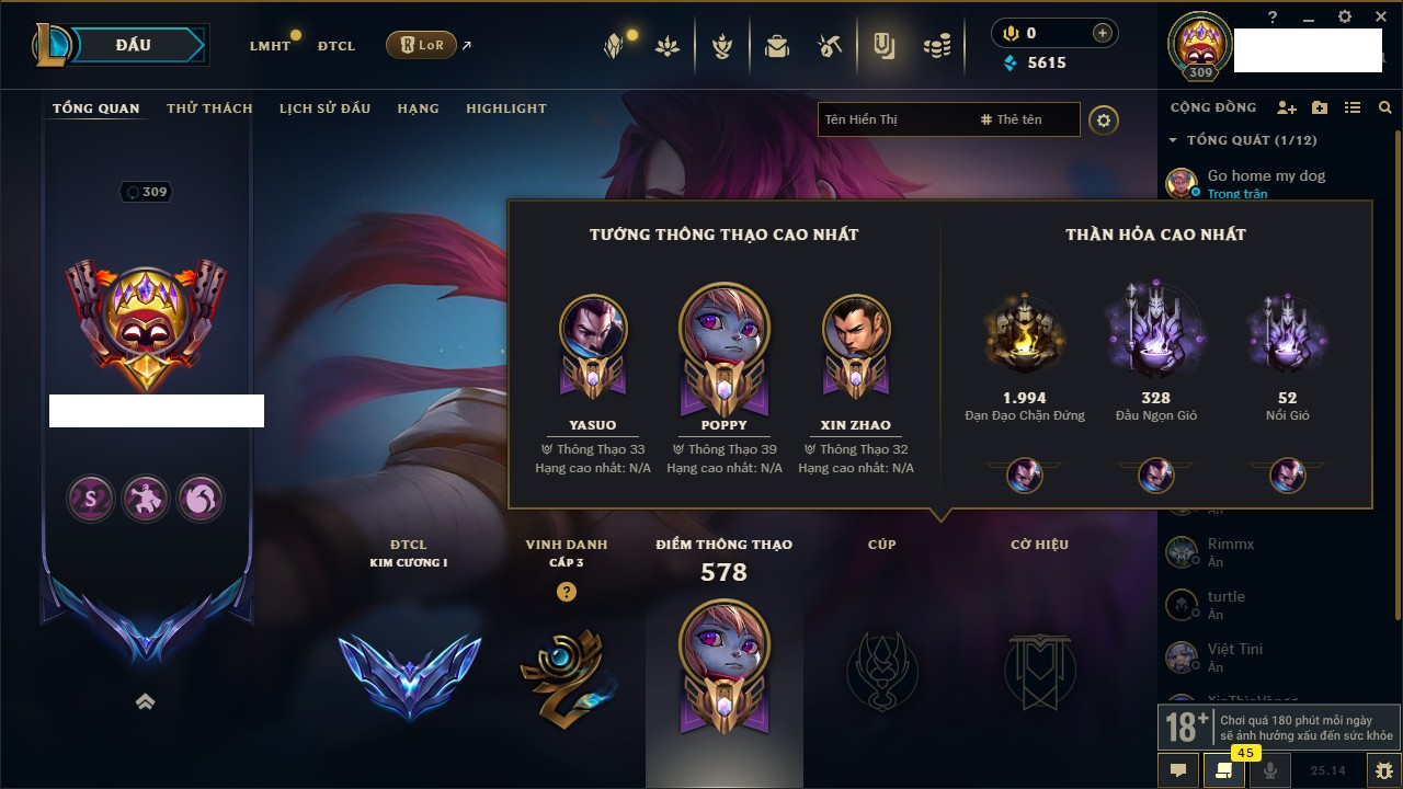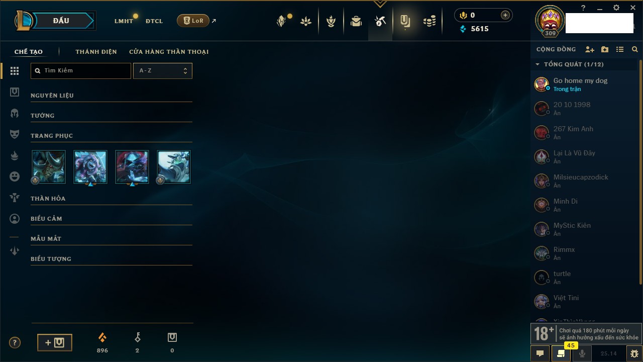 Rank Đơn: Bạch Kim IIKhung: Bạch kimTướng: 171 - Còn 316137 THXTrang Phục: 89Rank ĐTCL: Bạch Kim IIILinh Thú: 94