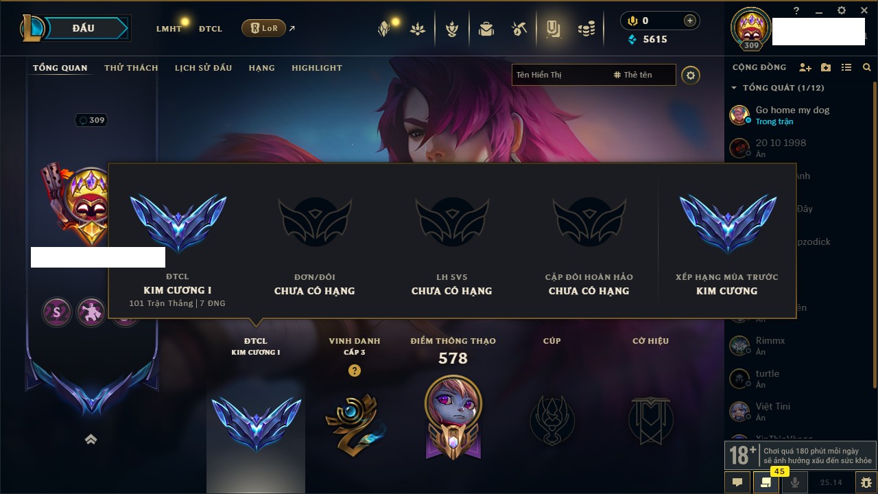 Rank Đơn: Vàng IIIKhung: VàngTướng: 172 - Còn 164704 THXTrang Phục: 255Rank ĐTCL: Kim Cương IVLinh Thú: 156
