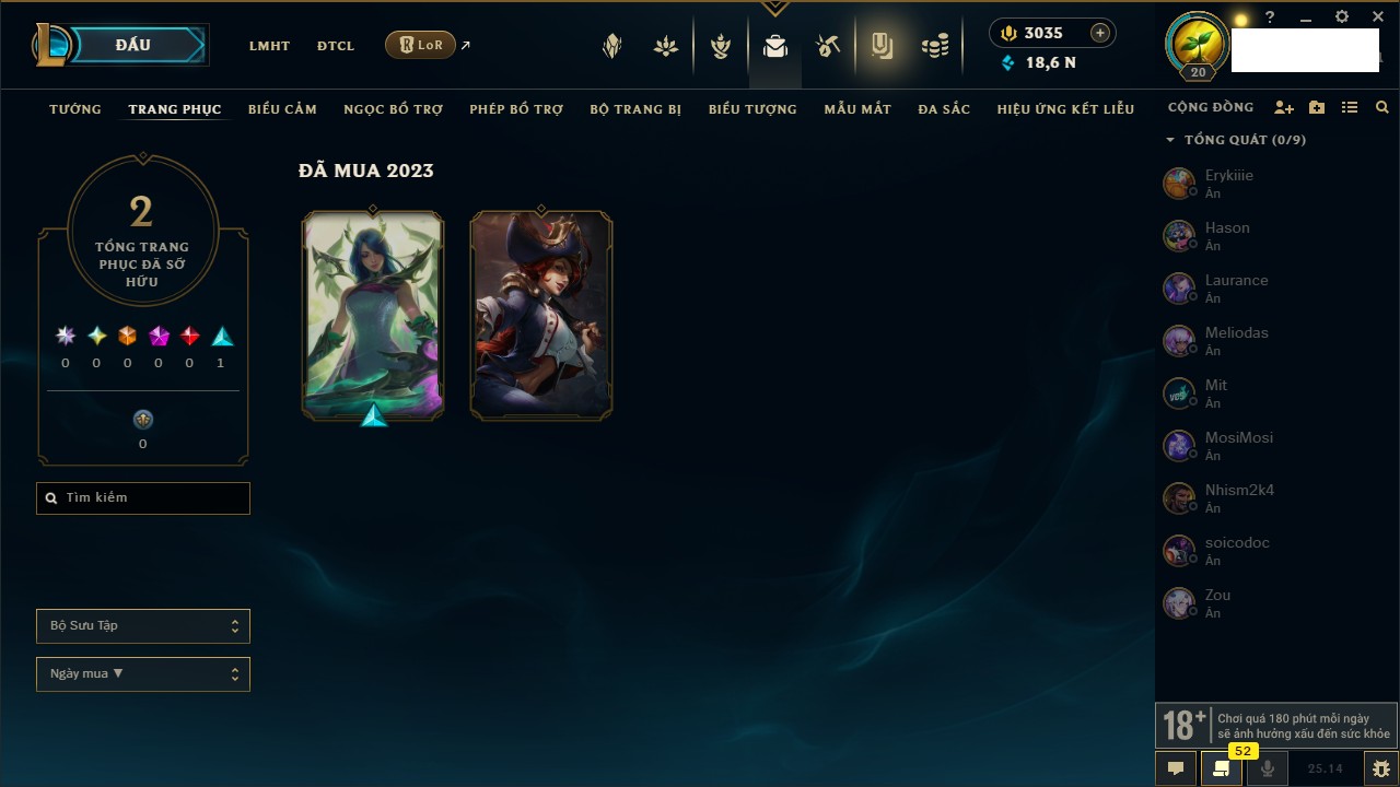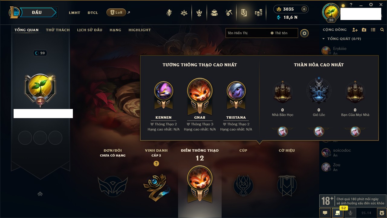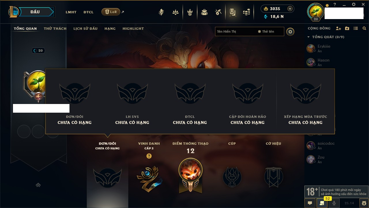 Rank Đơn: Chưa rank mùa nàoKhung: Chưa có khungTướng: 20 - Còn 2091 THXTrang Phục: 1Rank ĐTCL: Chưa RankLinh Thú: 4