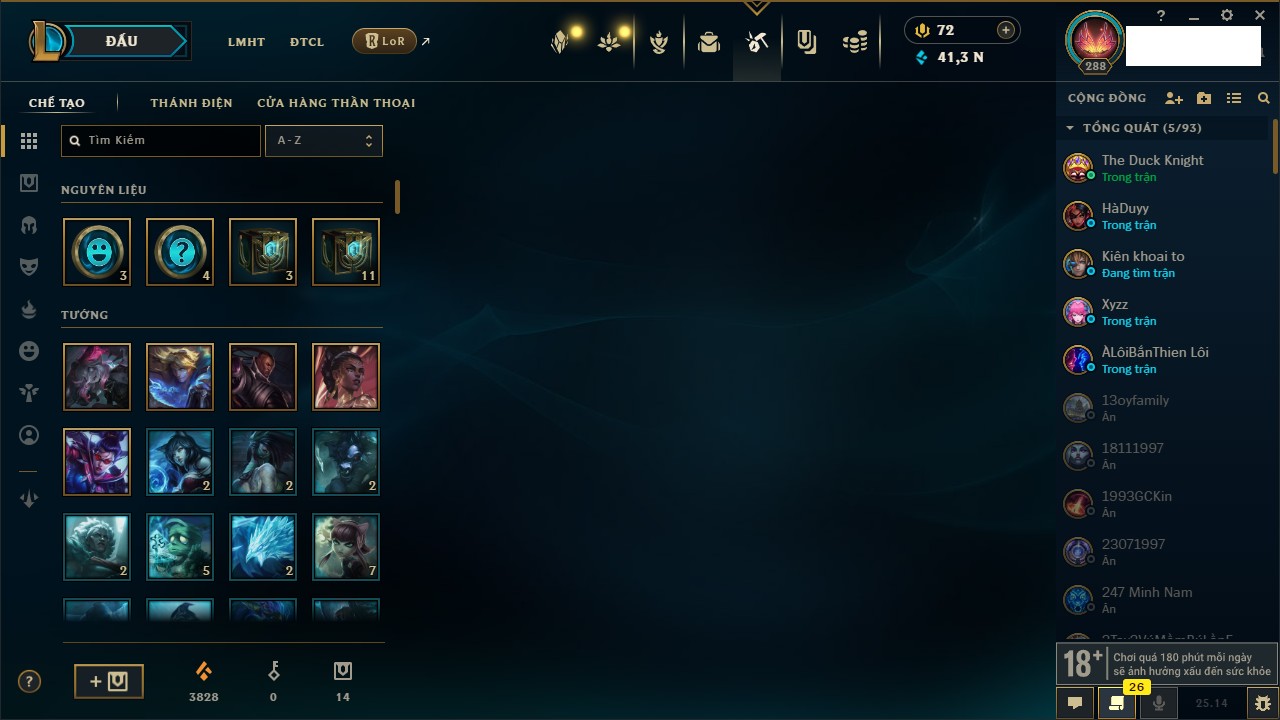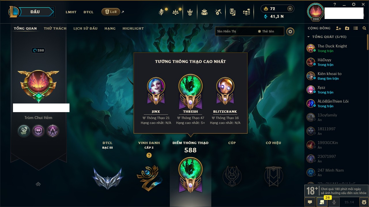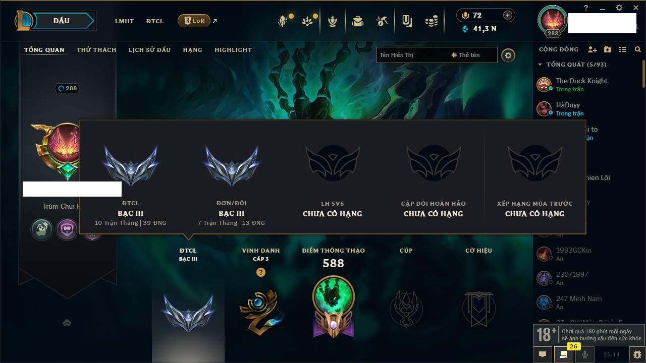 Rank Đơn: Đồng IV Khung: Chưa có khung Tướng: 171 - Còn 88838 THX Trang Phục: 103 Rank ĐTCL: Vàng IV Linh Thú: 139