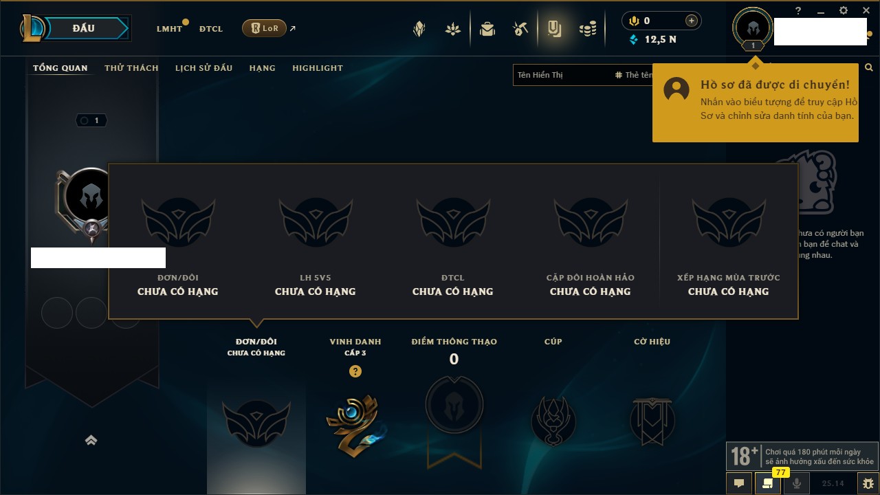 Rank Đơn: Vàng IKhung: Bạch kimTướng: 170 - Còn 212450 THXTrang Phục: 214Rank ĐTCL: Bạch Kim IVLinh Thú: 221