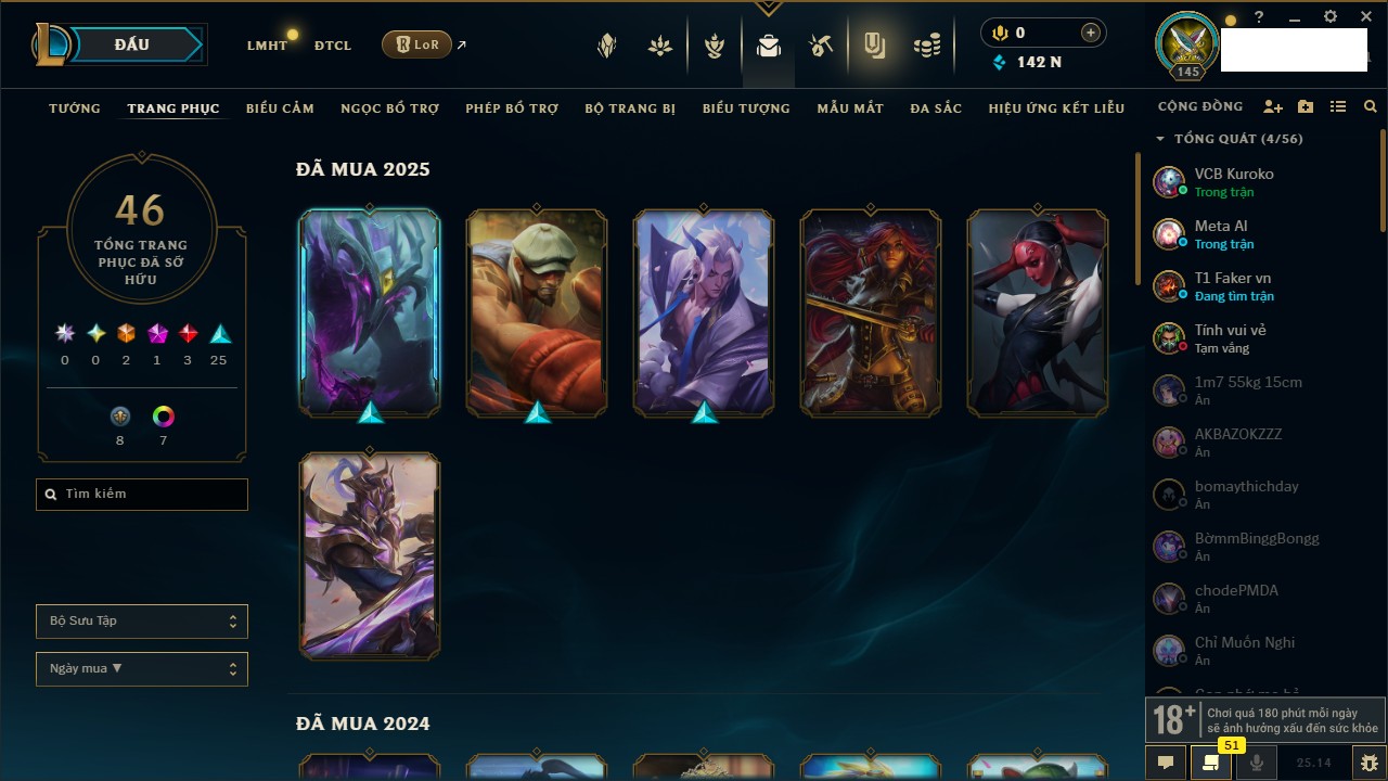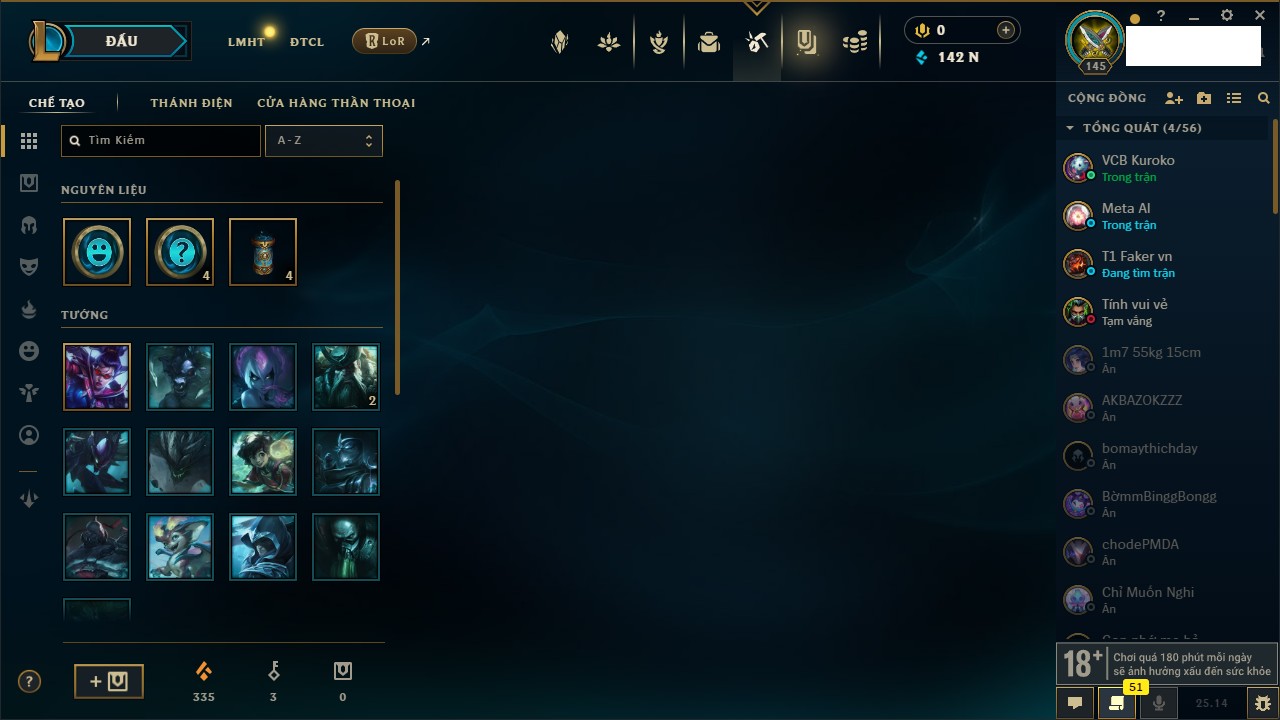 Rank Đơn: Đồng IIKhung: Chưa có khungTướng: 170 - Còn 56487 THXTrang Phục: 90Rank ĐTCL: Chưa RankLinh Thú: 129