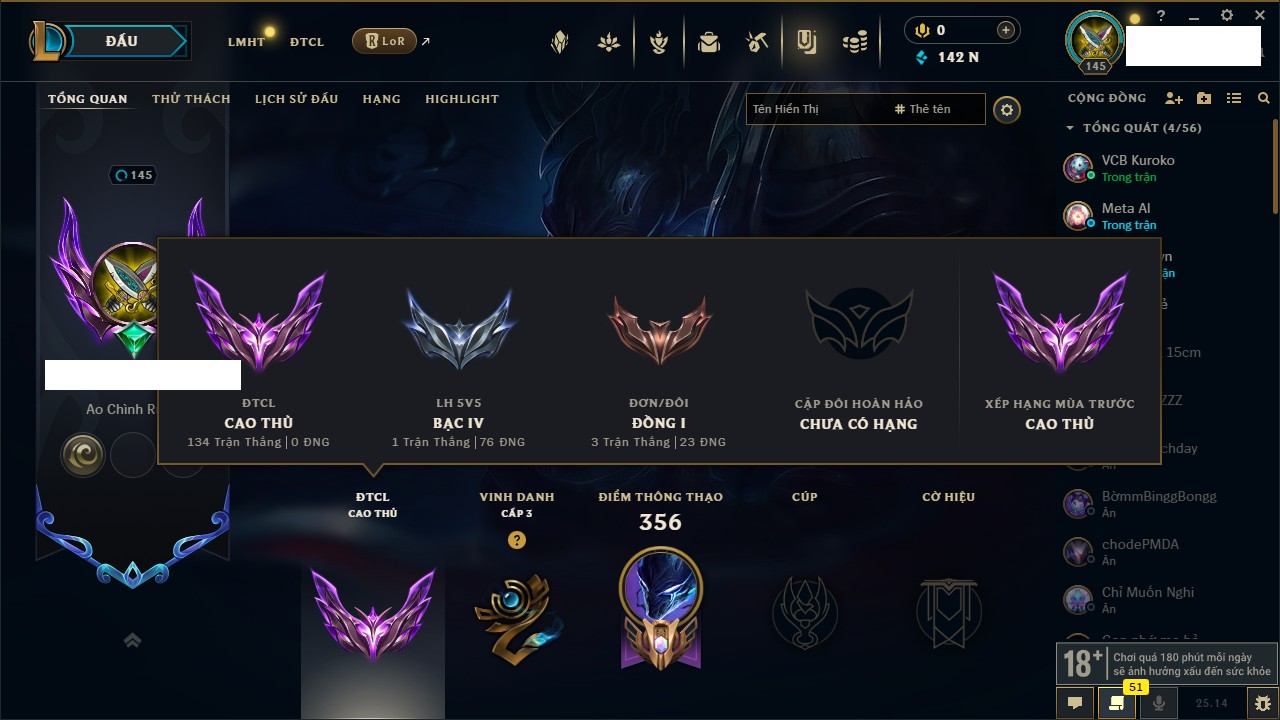 Rank Đơn: Đồng IIIKhung: ĐồngTướng: 171 - Còn 54778 THXTrang Phục: 96Rank ĐTCL: Bạch Kim IIILinh Thú: 140