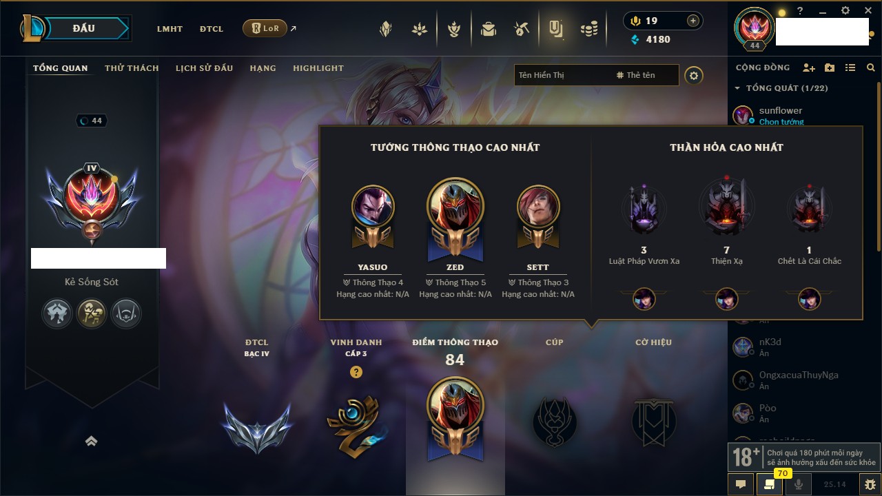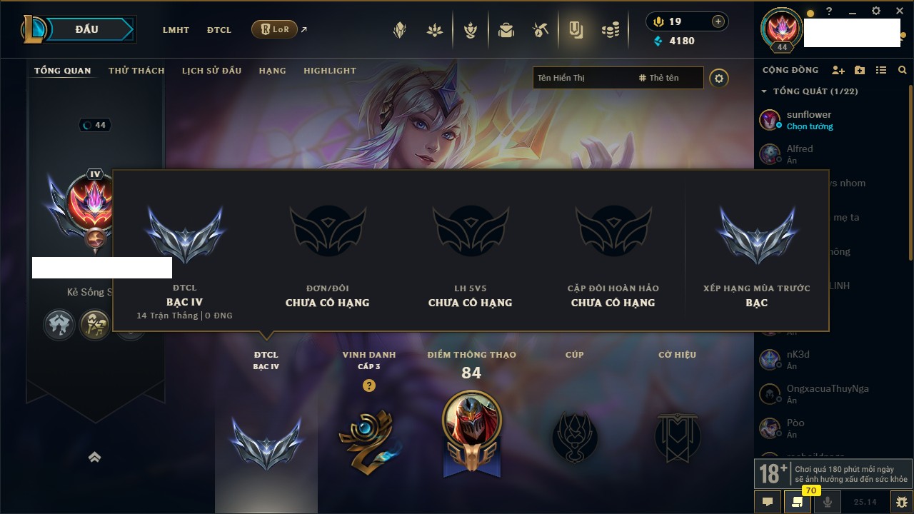 Rank Đơn: Chưa rank mùa nàoKhung: Chưa có khungTướng: 24 - Còn 30580 THXTrang Phục: 4Rank ĐTCL: Bạch Kim IIILinh Thú: 122