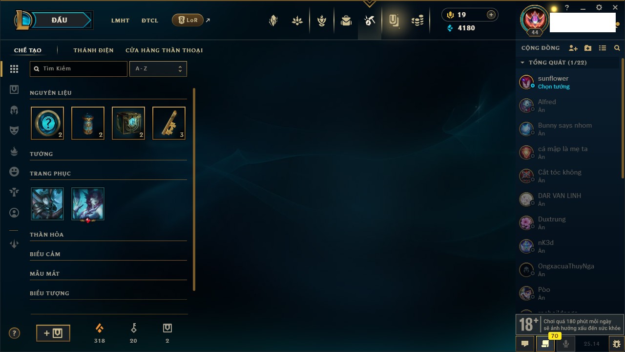 Rank Đơn: Chưa RankKhung: Chưa có khungTướng: 37 - Còn 27387 THXTrang Phục: 10Rank ĐTCL: Chưa RankLinh Thú: 1