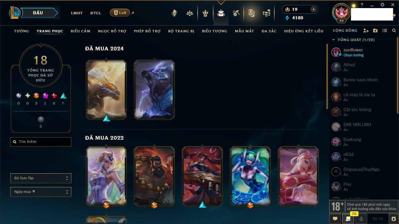 Rank Đơn: Chưa RankKhung: Chưa có khungTướng: 165 - Còn 3214 THXTrang Phục: 160Rank ĐTCL: Chưa RankLinh Thú: 28