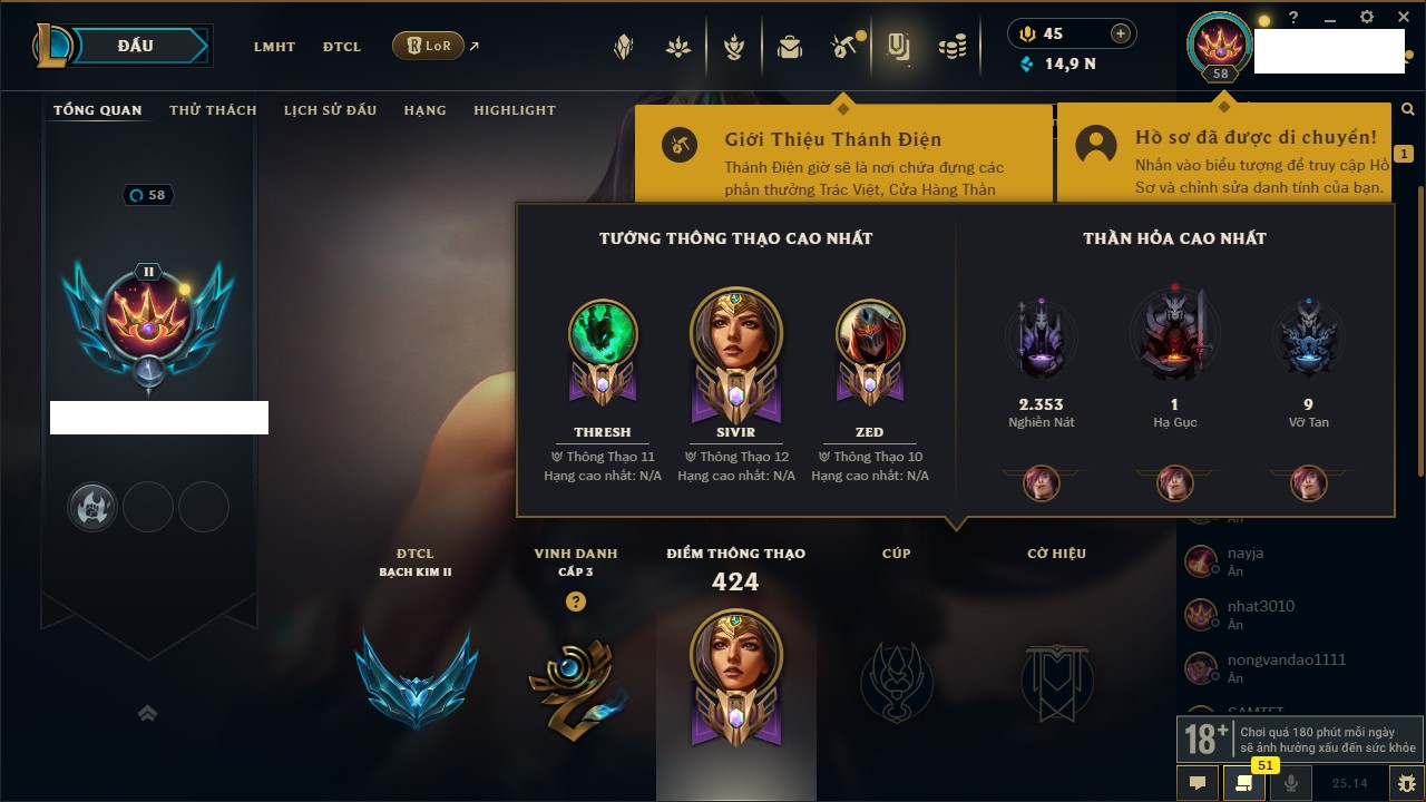 Rank Đơn: Vàng IVKhung: BạcTướng: 171 - Còn 231097 THXTrang Phục: 180Rank ĐTCL: Vàng IVLinh Thú: 110