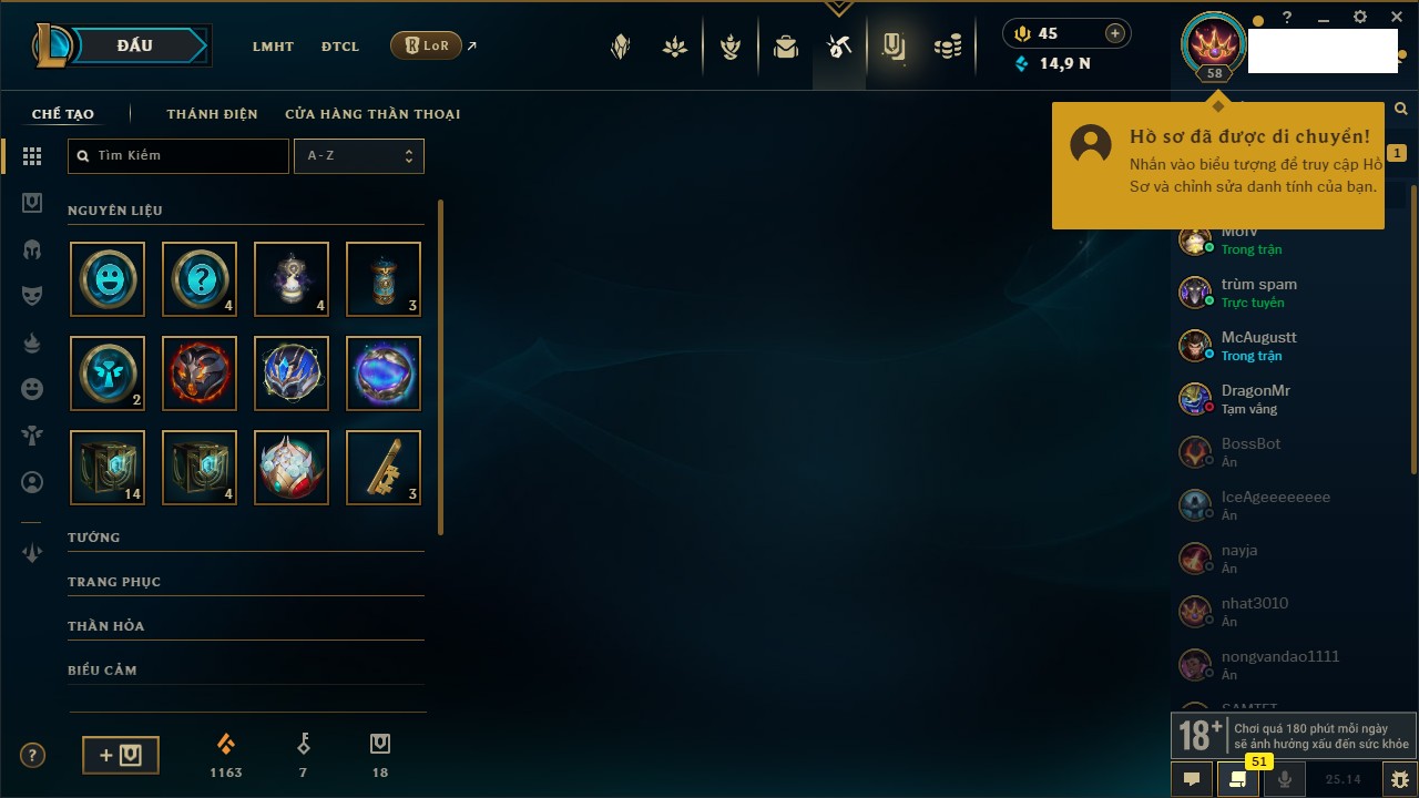 Rank Đơn: Vàng IVKhung: BạcTướng: 166 - Còn 180925 THXTrang Phục: 163Rank ĐTCL: Chưa RankLinh Thú: 67