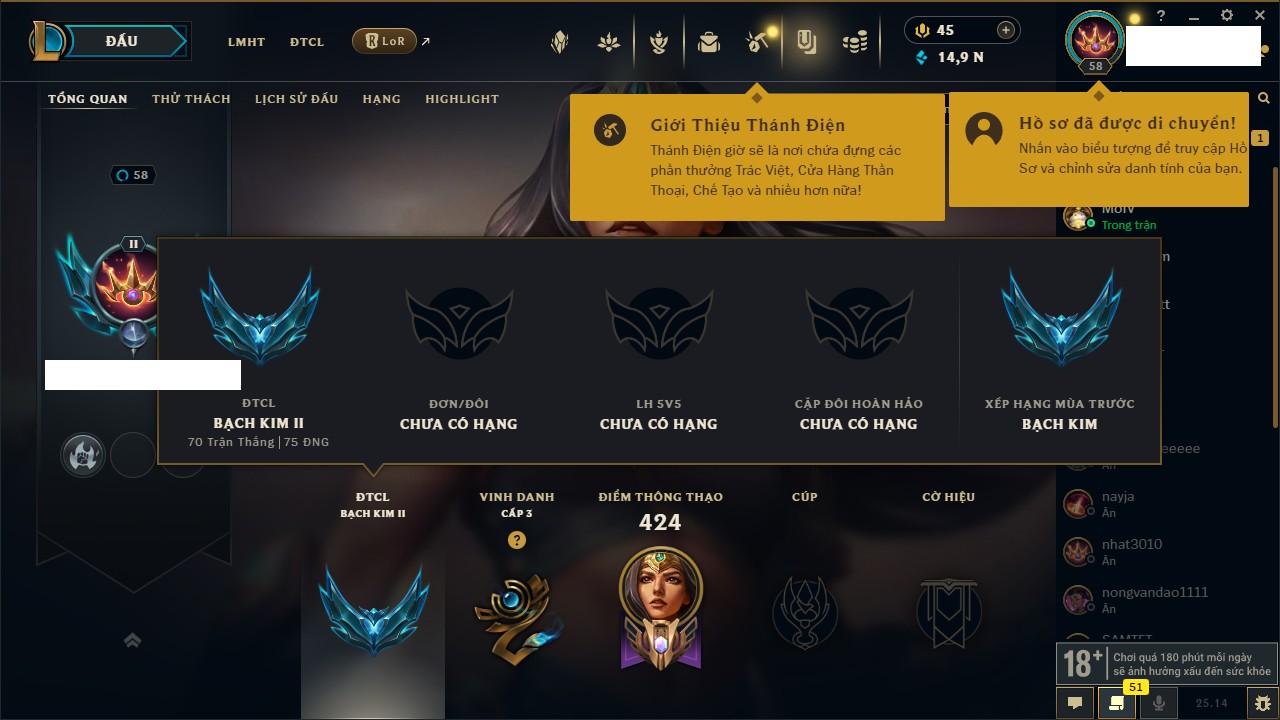Rank Đơn: Bạc IIKhung: VàngTướng: 171 - Còn 332462 THXTrang Phục: 165Rank ĐTCL: Kim Cương IVLinh Thú: 181