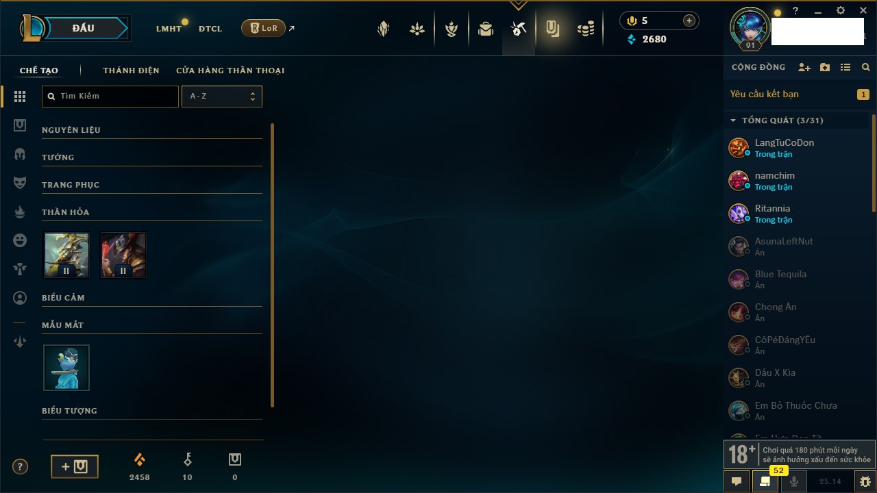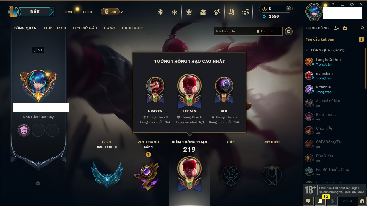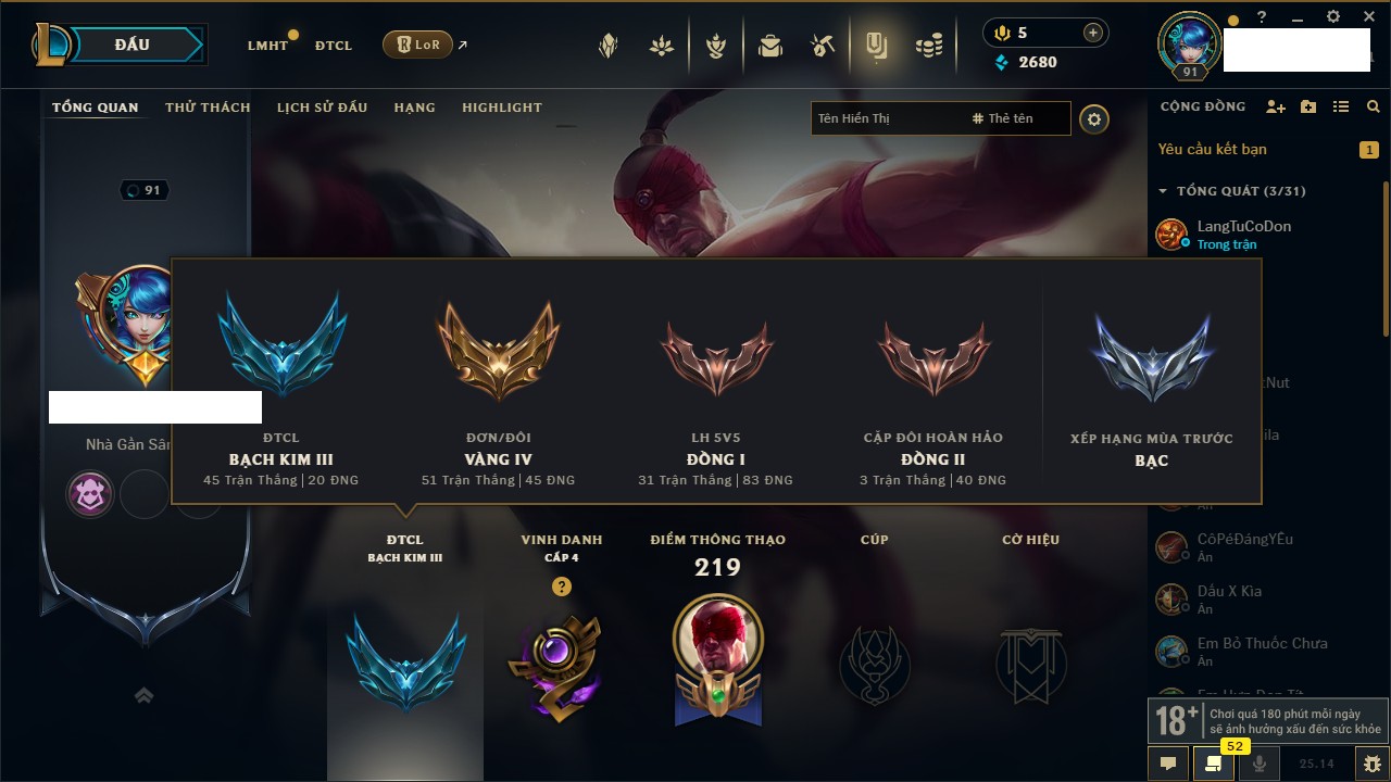 Rank Đơn: Bạc IIIKhung: Chưa có khungTướng: 171 - Còn 21493 THXTrang Phục: 252Rank ĐTCL: Bạch Kim IVLinh Thú: 123