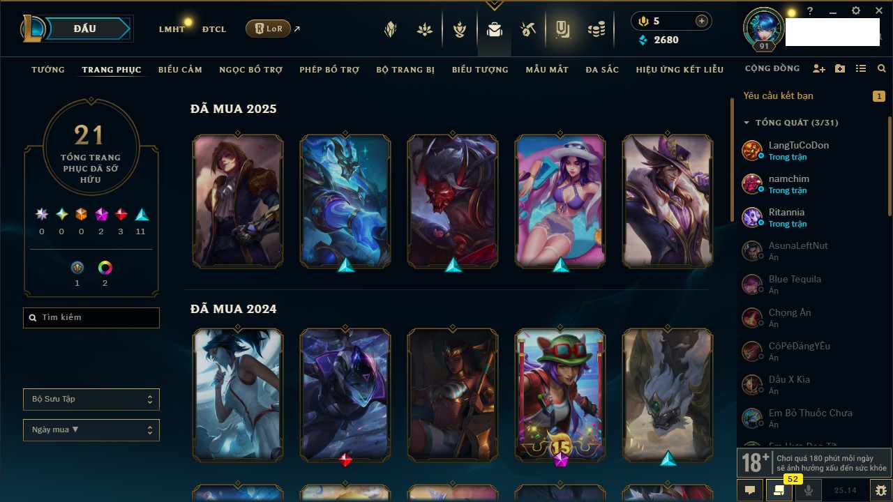 Rank Đơn: Vàng IIKhung: VàngTướng: 171 - Còn 34018 THXTrang Phục: 250Rank ĐTCL: Sắt IILinh Thú: 19