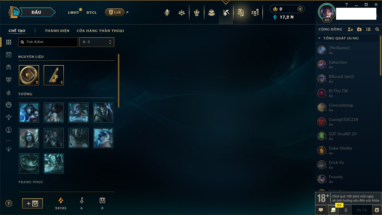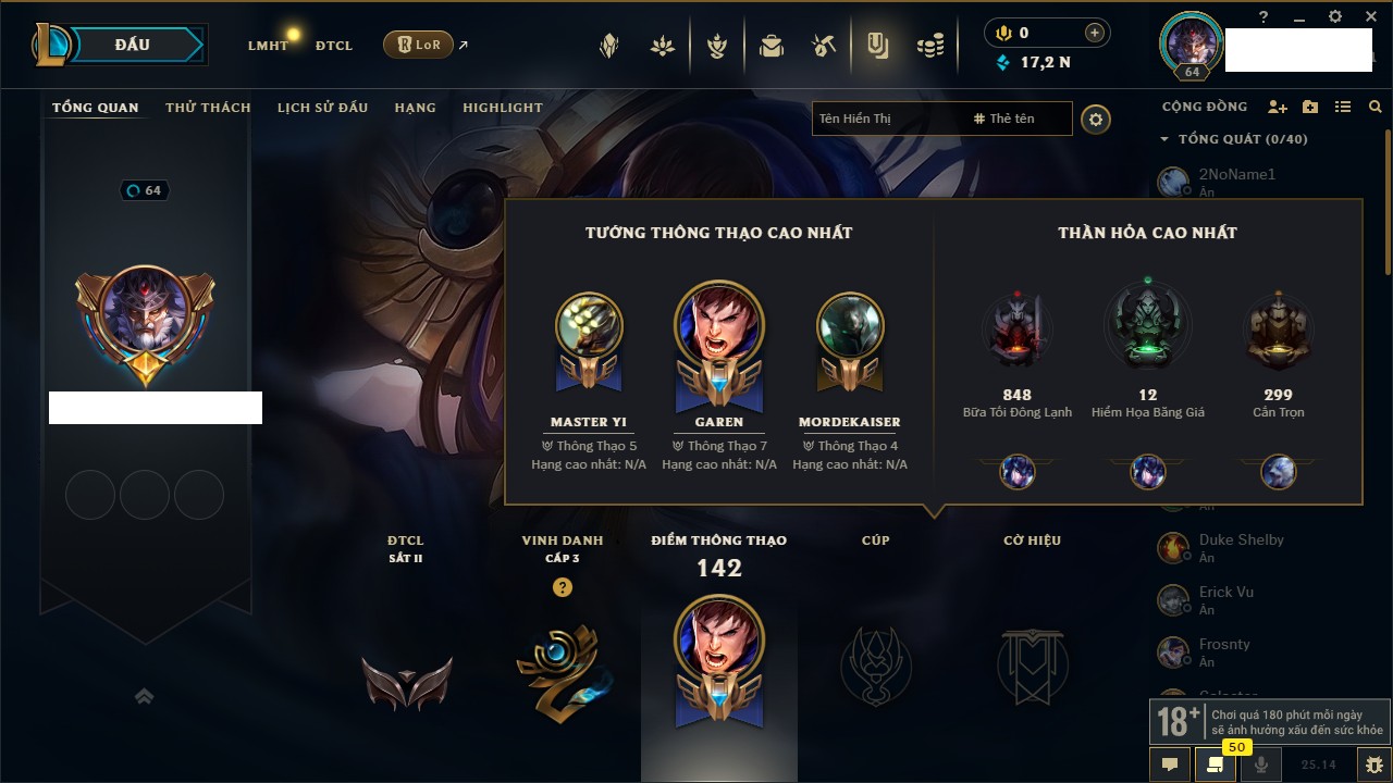 Rank Đơn: Bạc IVKhung: VàngTướng: 172 - Còn 358384 THXTrang Phục: 177Rank ĐTCL: Lục Bảo IILinh Thú: 211