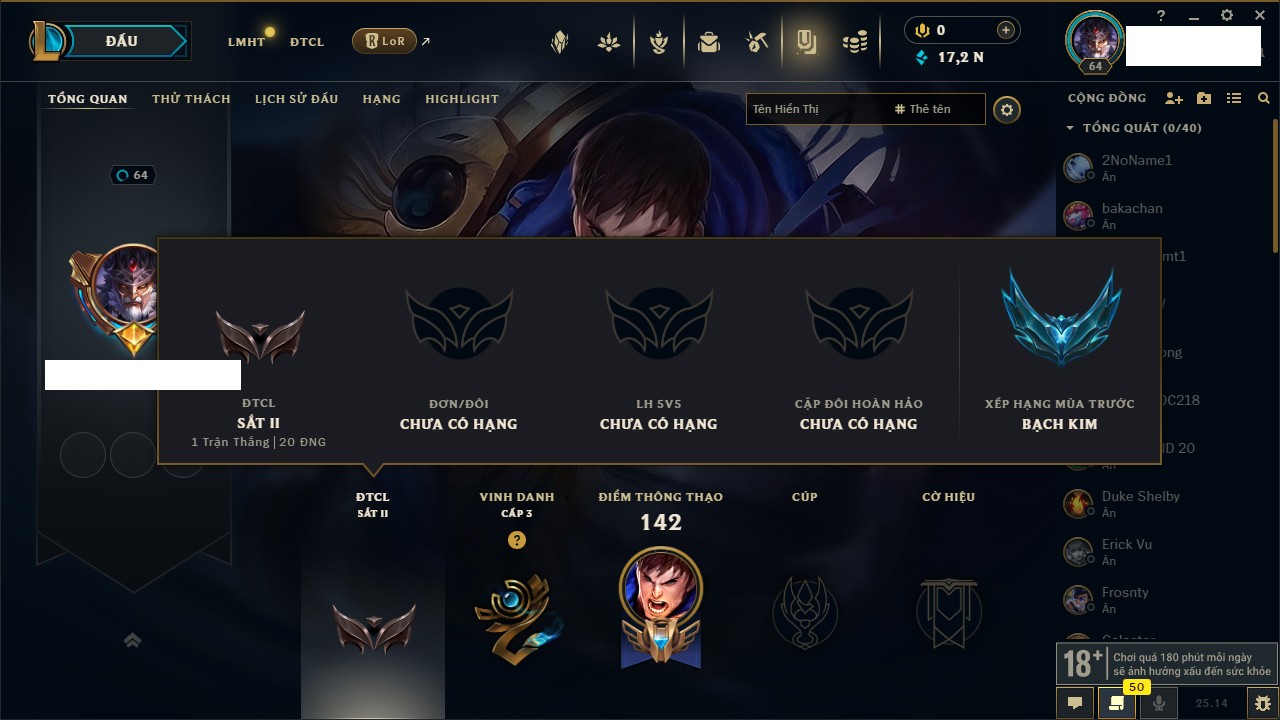 Rank Đơn: Đồng IKhung: ĐồngTướng: 171 - Còn 32479 THXTrang Phục: 172Rank ĐTCL: Bạch Kim IILinh Thú: 36