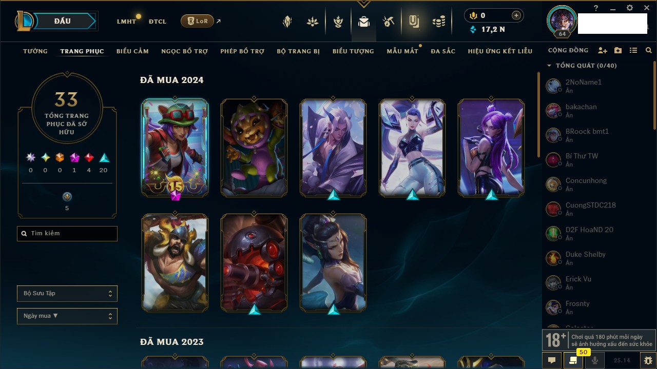Rank Đơn: Vàng IVKhung: VàngTướng: 171 - Còn 48721 THXTrang Phục: 171Rank ĐTCL: Chưa RankLinh Thú: 27