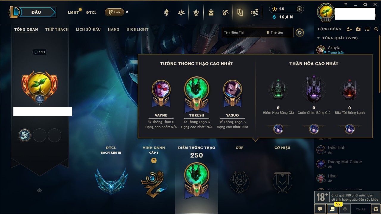 Rank Đơn: Vàng IVKhung: BạcTướng: 166 - Còn 180925 THXTrang Phục: 163Rank ĐTCL: Chưa RankLinh Thú: 67