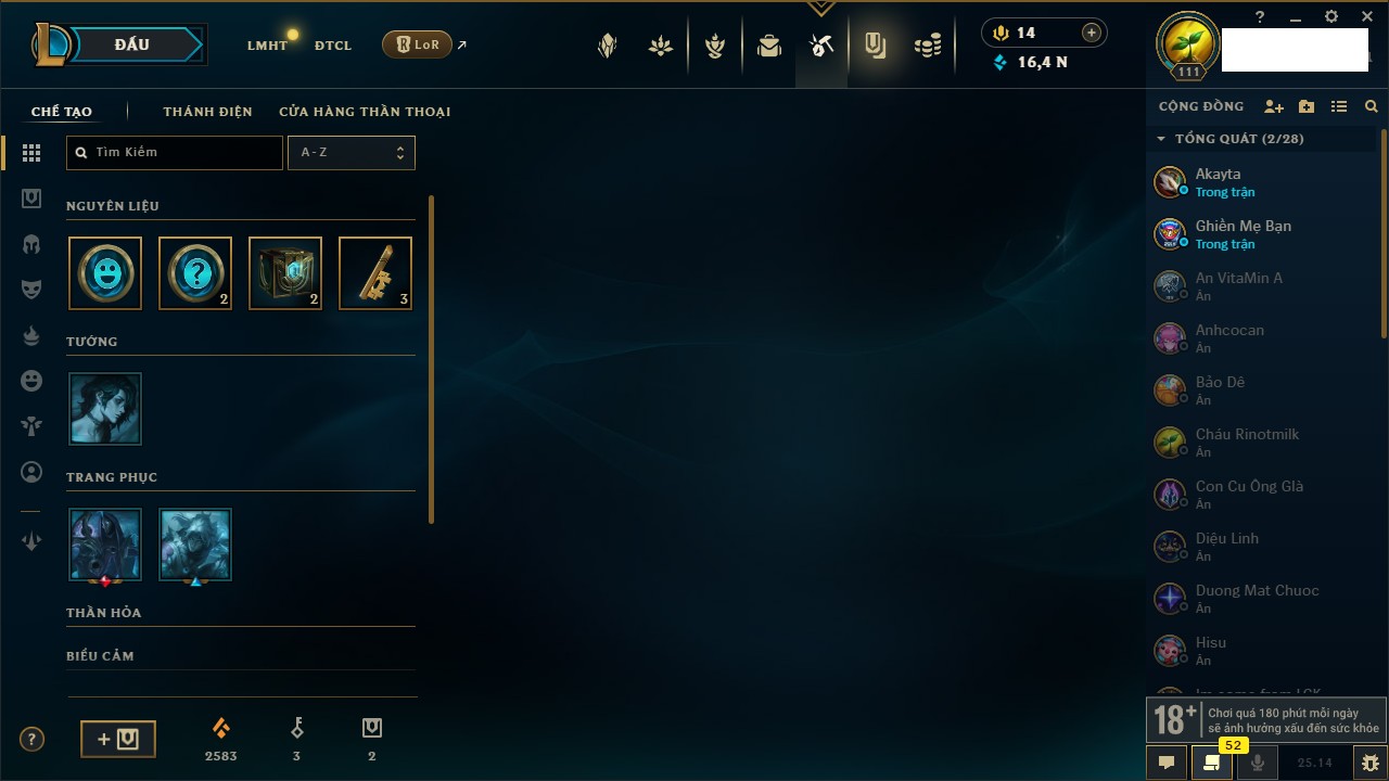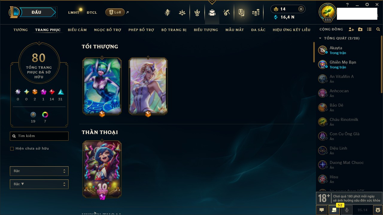 Rank Đơn: Vàng IVKhung: BạcTướng: 171 - Còn 426239 THXTrang Phục: 162Rank ĐTCL: Chưa RankLinh Thú: 33