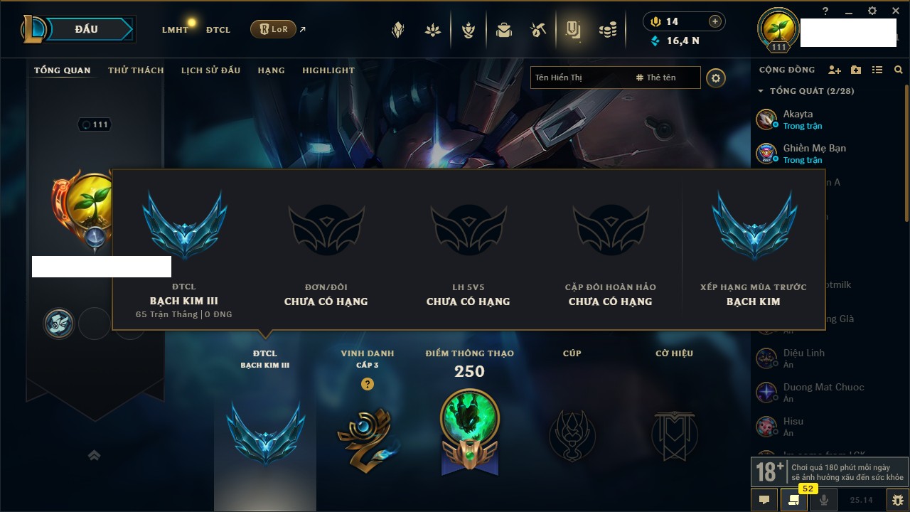 Rank Đơn: Bạc IIKhung: VàngTướng: 171 - Còn 332462 THXTrang Phục: 165Rank ĐTCL: Kim Cương IVLinh Thú: 181