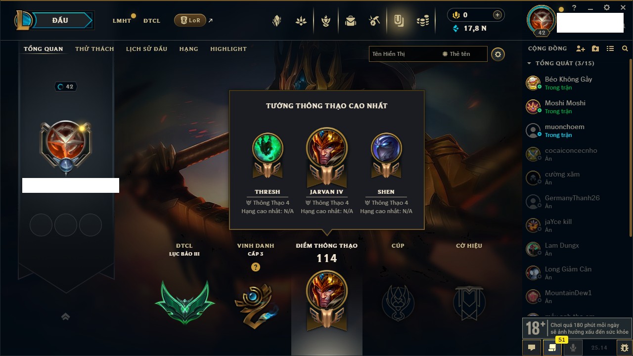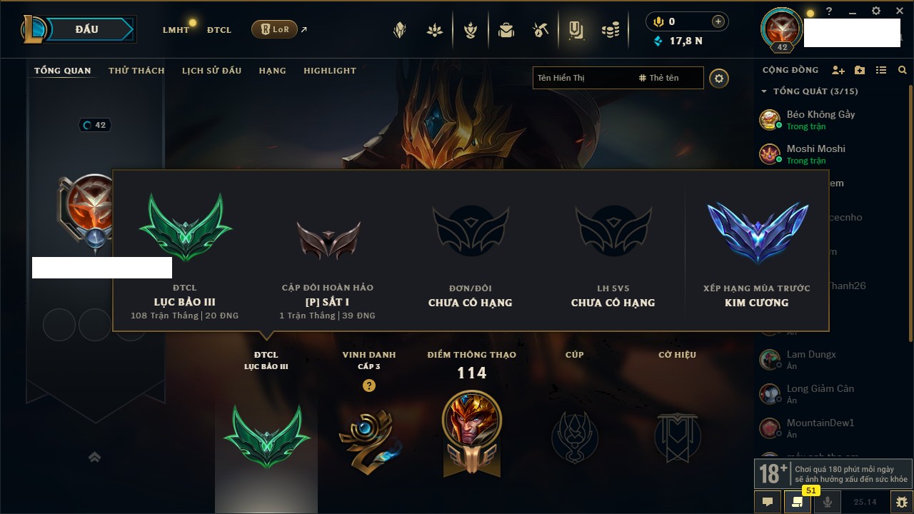 Rank Đơn: Bạc III Khung: Bạc Tướng: 170 - Còn 30078 THX Trang Phục: 225 Rank ĐTCL: Chưa Rank Linh Thú: 138