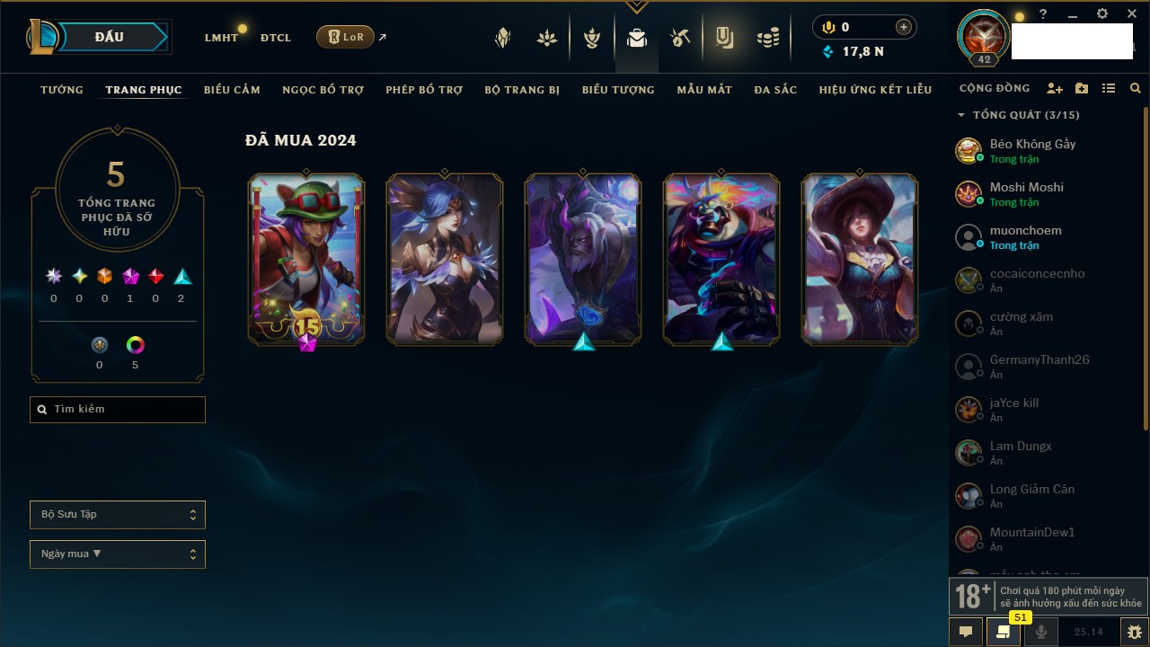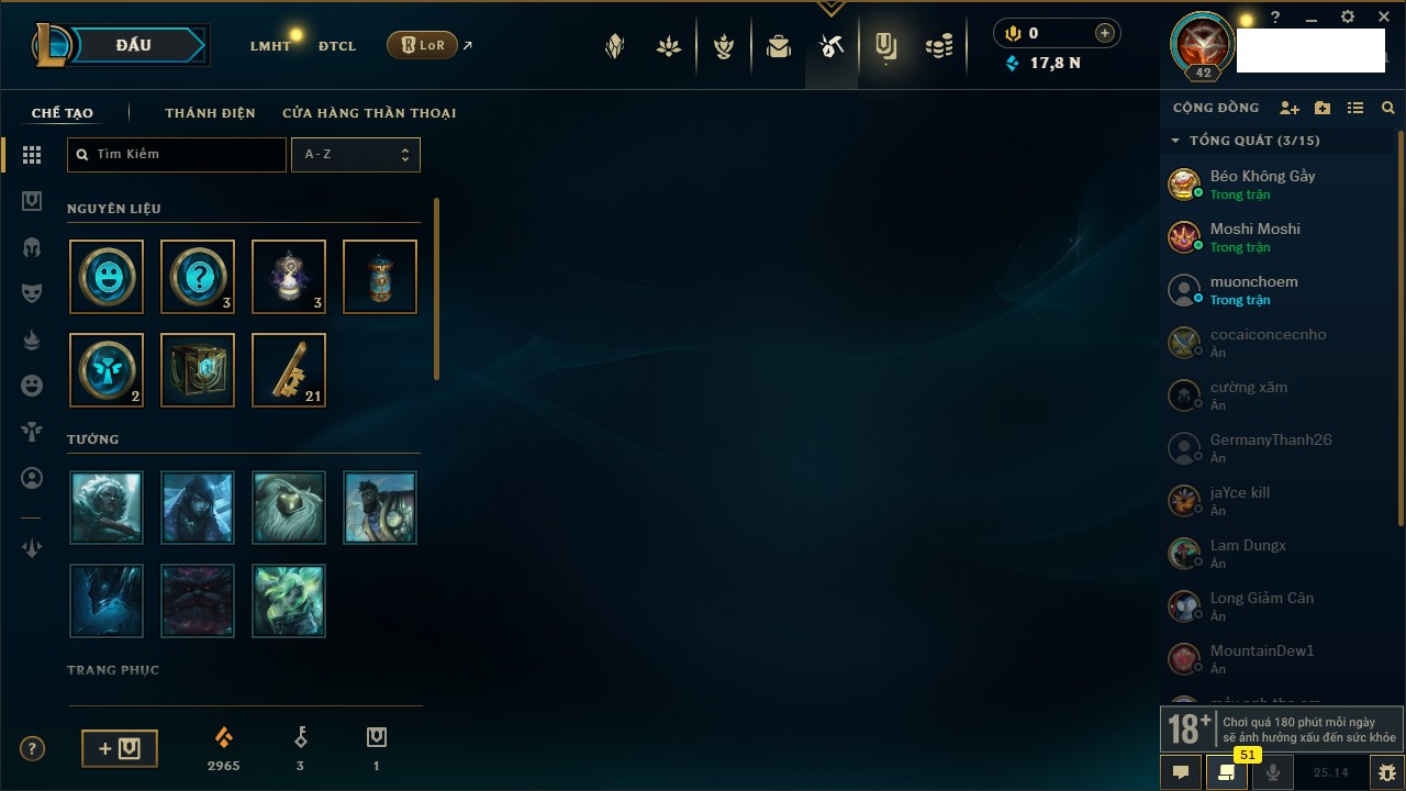 Rank Đơn: Chưa rank mùa nào Khung: Chưa có khung Tướng: 3 - Còn 3800 THX Trang Phục: 0 Rank ĐTCL: Chưa Rank Linh Thú: 31