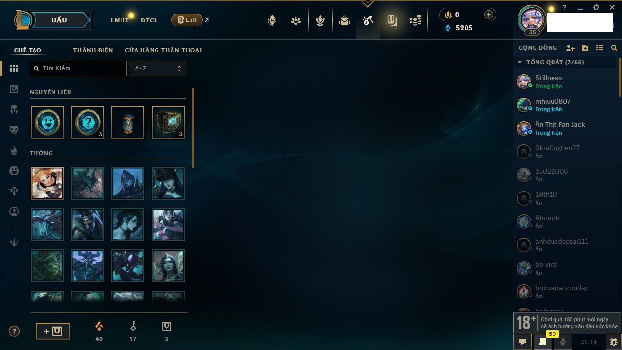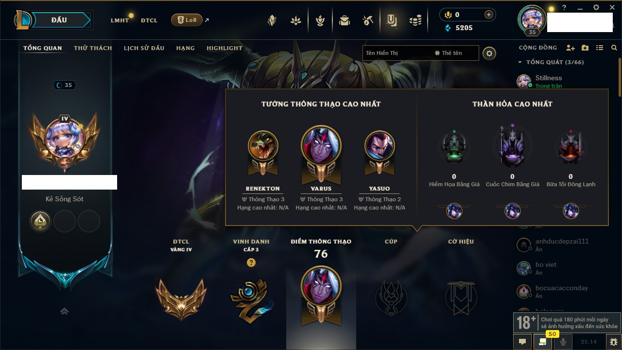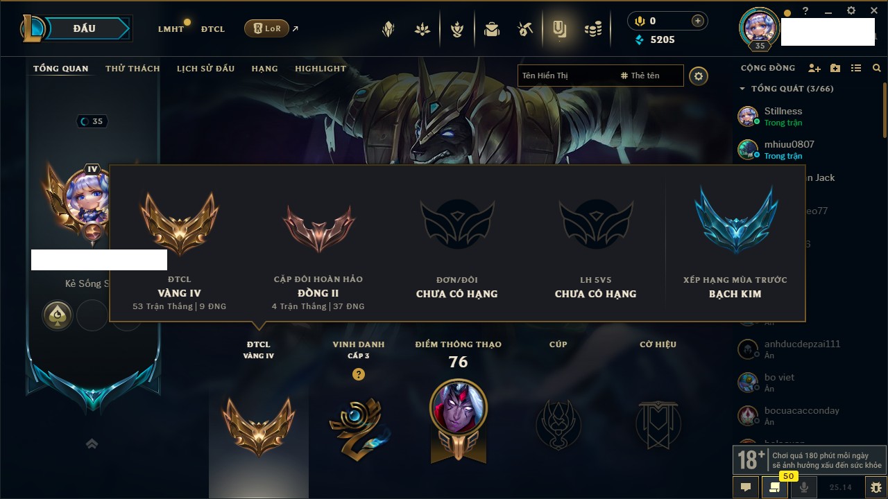 Rank Đơn: Vàng IKhung: Bạch kimTướng: 170 - Còn 212450 THXTrang Phục: 214Rank ĐTCL: Bạch Kim IVLinh Thú: 221