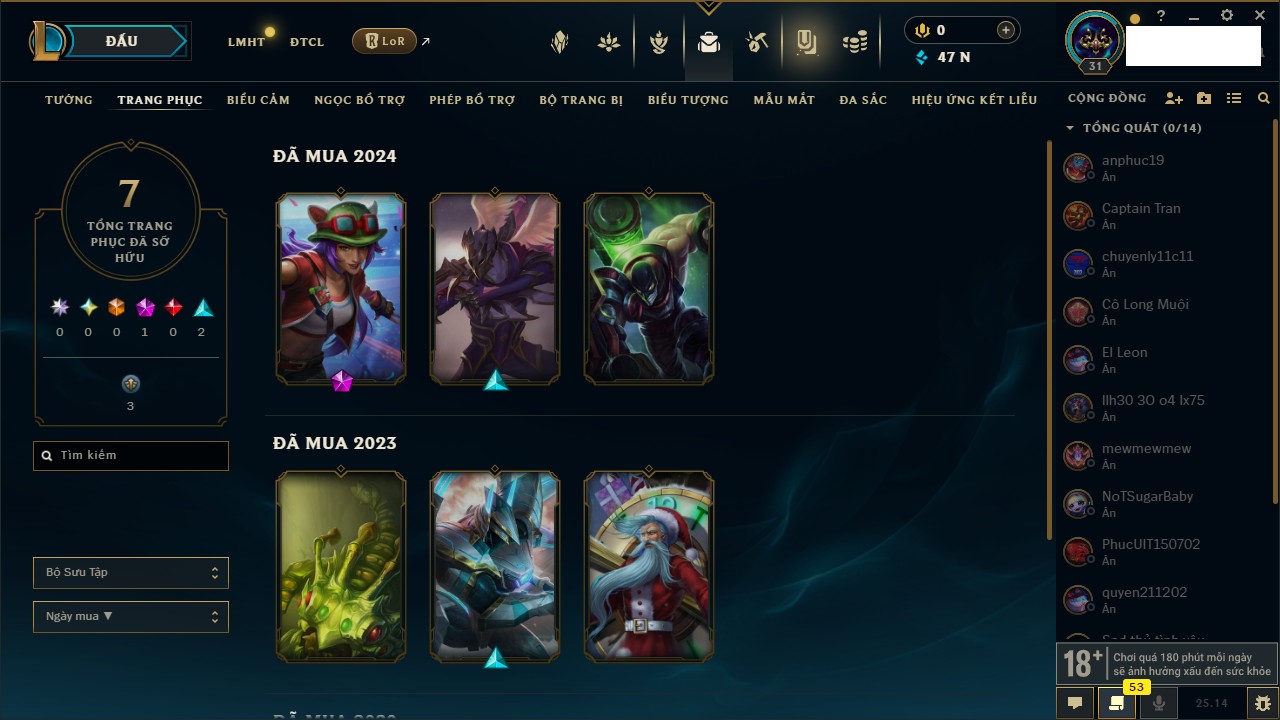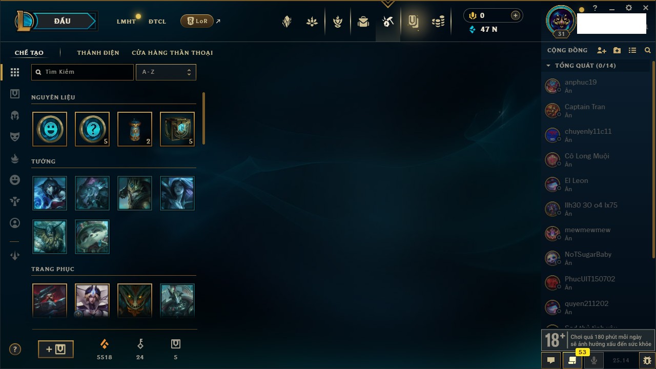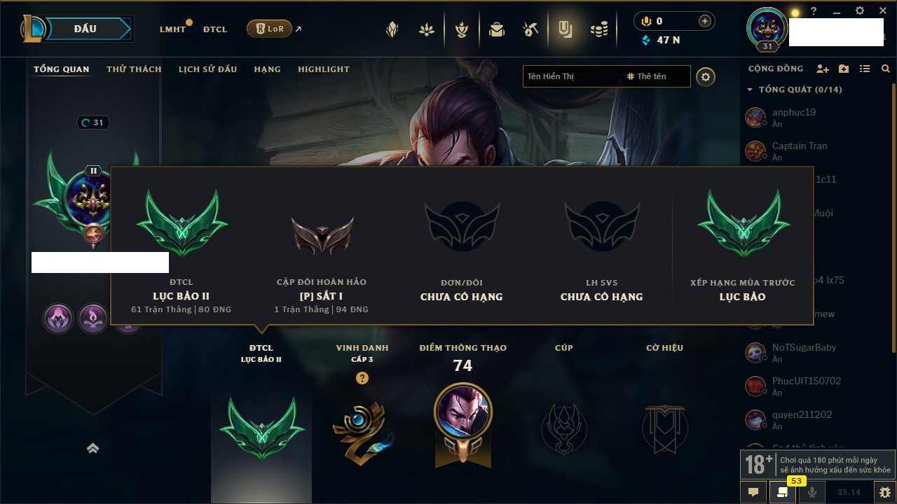 Rank Đơn: Vàng IIKhung: VàngTướng: 171 - Còn 219803 THXTrang Phục: 254Rank ĐTCL: Chưa RankLinh Thú: 78