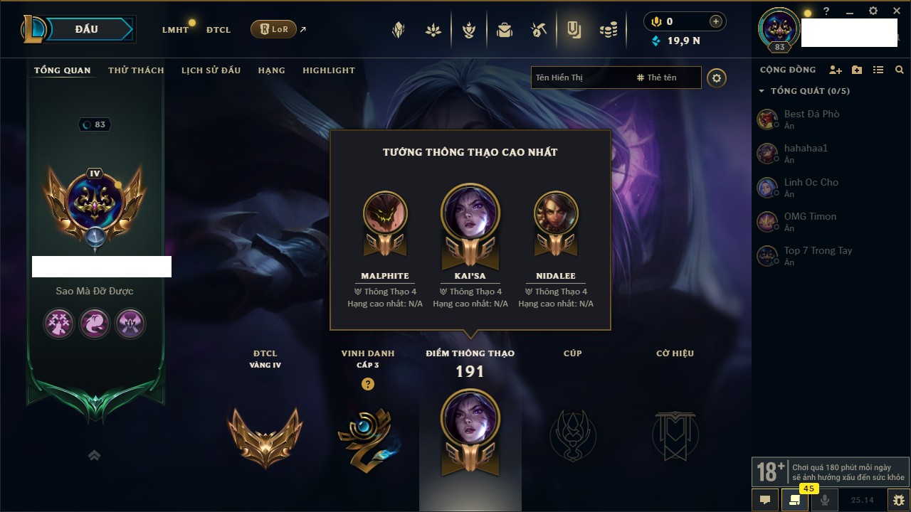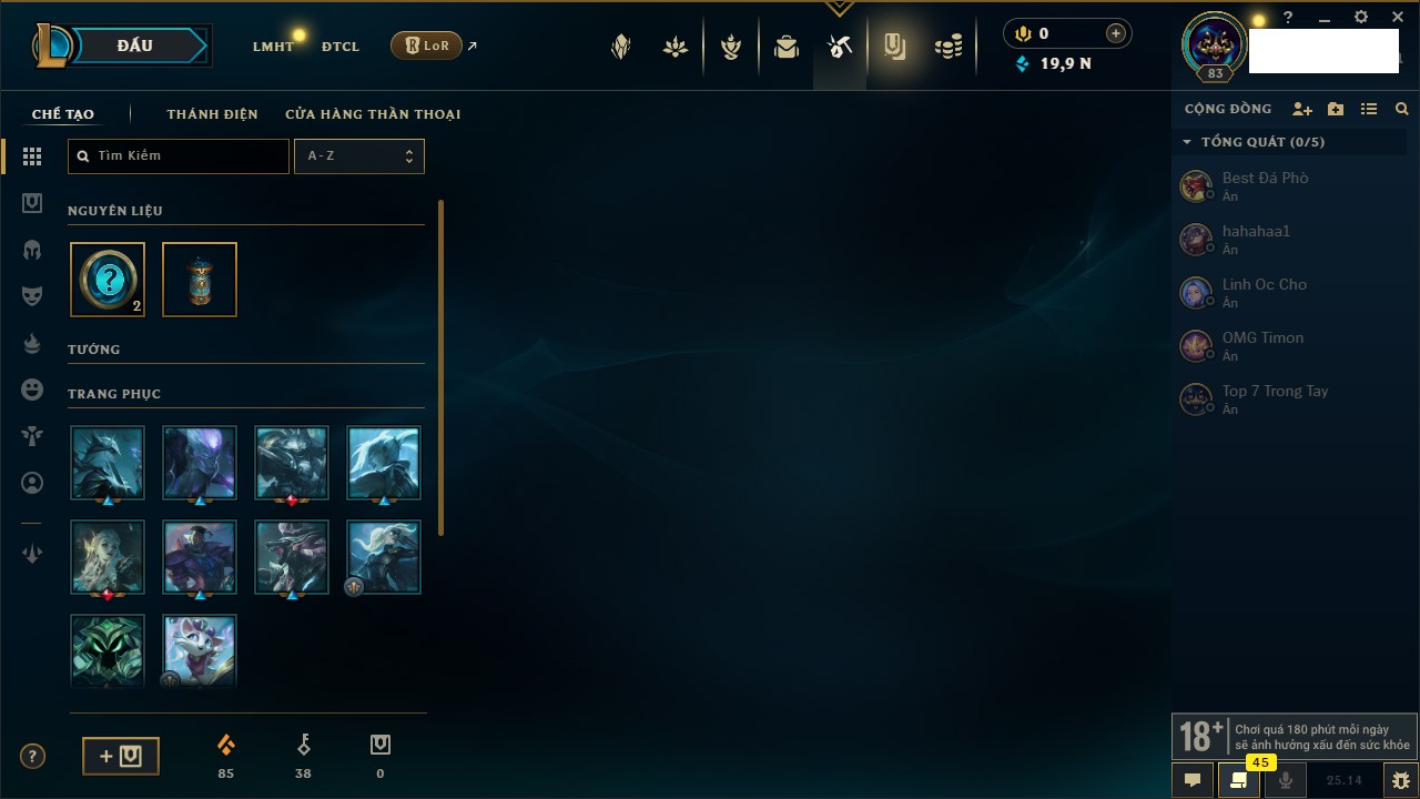 Rank Đơn: Vàng IIIKhung: BạcTướng: 171 - Còn 101359 THXTrang Phục: 88Rank ĐTCL: Kim Cương IVLinh Thú: 200