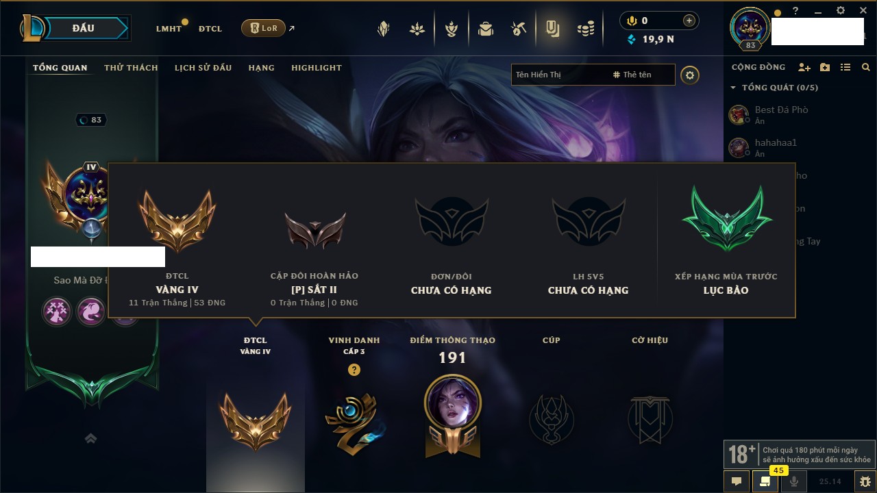 Rank Đơn: Lục Bảo IVKhung: Bạch kimTướng: 171 - Còn 128452 THXTrang Phục: 193Rank ĐTCL: Bạc IIILinh Thú: 100